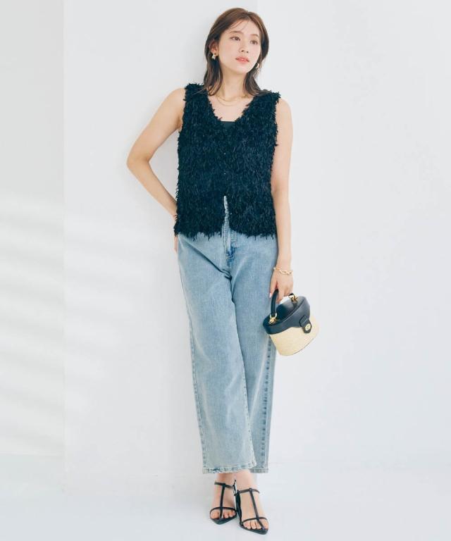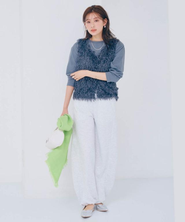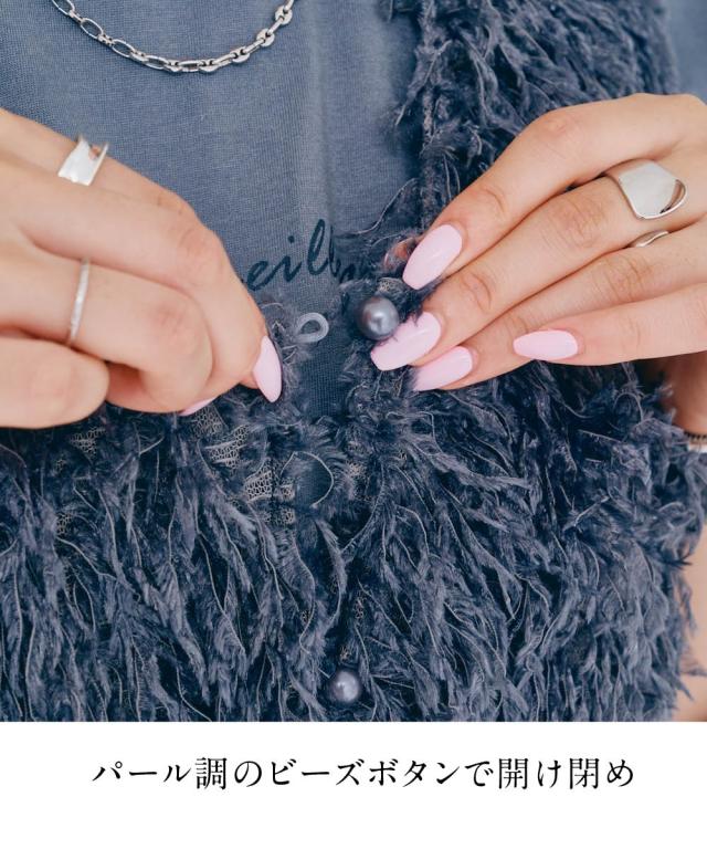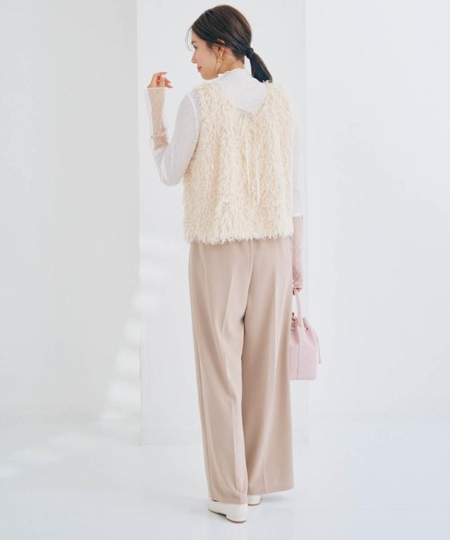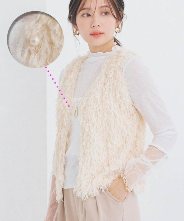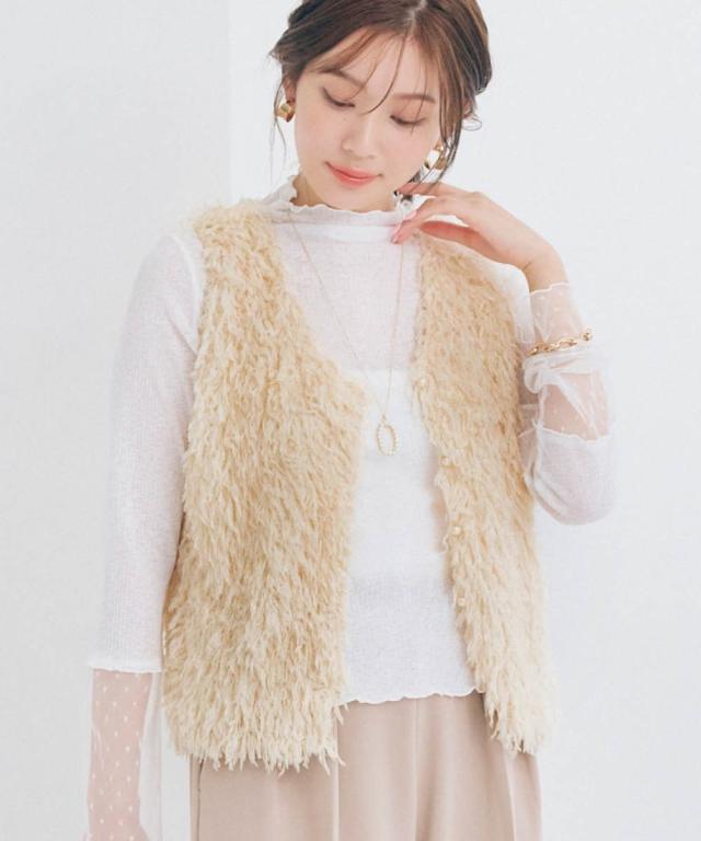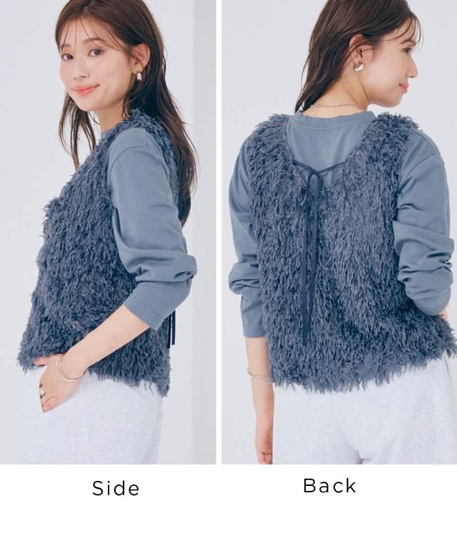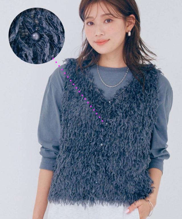 羽織るだけで、コーデを格上げしてくれる2WAYフェザーベスト前後2WAYで着られるから、その日の気分やコーディネートに合わせて気回せる! ■デザイン ふわふわとしたフェザーのような素材感が目を引く、トレンド感満載のベスト。最大の魅力は、前後2WAYで着用できるデザイン。ボタンを前にしてカーディガン風に、あるいはボタンを後ろにしてプルオーバー風にと、着こなしの幅がぐっと広がります。Vネック側は、長めのサテンリボンがデザインポイント。インナーを選ばずすっきりと着こなせ、気になる腰回りをさりげなくカバーしてくれる丈感も 程よいボリューム感がありながらも、着膨れしにくい計算されたシルエットは、大人の女性が求める上品さと体型カバーを両立。カジュアルなTシャツスタイルに羽織るだけで、一気にこなれた印象を与え、いつものコーディネートを格上げしてくれます。 ■素材 ふんわりとした柔らかな肌触りが魅力のフェザー素材を使用しています。軽やかな着心地で、肩への負担も少なく、長時間着用してもストレスフリー。デリケートな素材でありながらも、ご自宅で簡単にお手入れできるのは嬉しいポイント。毛足の長いフェザーが、動くたびに揺れて表情豊かな印象を与え、シン