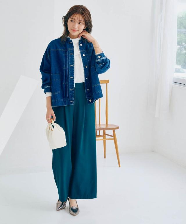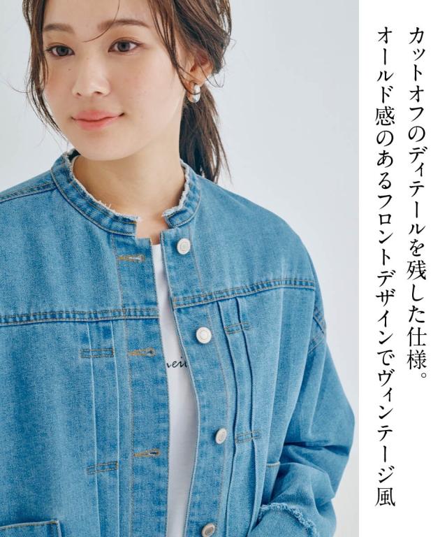 加工感が魅力の綿100%ノーカラーデニムジャケット ■デザイン 旬な抜け感を出せるルーズフィットなシルエットで、軽く羽織るだけで、こなれた大人カジュアルスタイルに仕上がるデザインのデニムジャケット。襟ぐりや袖をフリンジ仕様に、表面にもヴィンテージ感を演出する加工を施しました。すっきりとしたノーカラーと華奢見えするドロップショルダー、長すぎない程よい丈感の絶妙なバランスが女性らしく着こなせるポイント 袖にはタックを入れることでシルエットに丸みが生まれ、可愛らしい雰囲気をプラス。合わせるインナーやボトムを選ばないので着回しやすく、ロングシーズン活躍する万能なGジャンです。 ■素材 肌に優しく、快適な着心地を叶える綿100%素材を使用しています。シーズンレスで活躍する10.5ozのレギュラーオンスは柔らかく、羽織心地の良さも嬉しいポイントです。通気性にも優れているため、季節の変わり目からロングシーズン活躍します。使い込むほどにより味の出るヴィンテージ感も魅力 ■おすすめのスタイリング 大人の女性が楽しむ上品カジュアルスタイルにぴったりです。柔らかな素材感のプリーツスカートやフレアスカートと合わせれば、デニムのカジュアルさとスカート