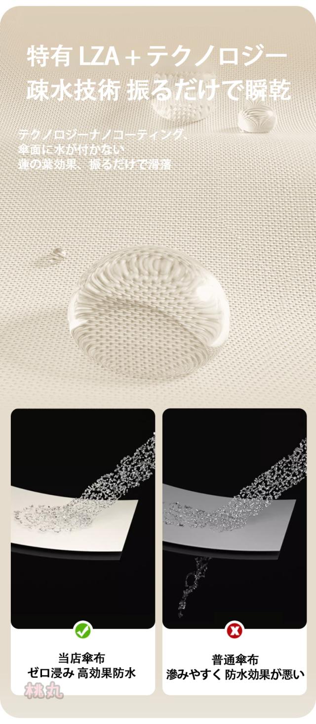 高密度布採用、超撥水のテフロン加工が施されています。傘を閉じた後、軽く振るだけでしっかり雨を弾き、豪雨でも対応できます。