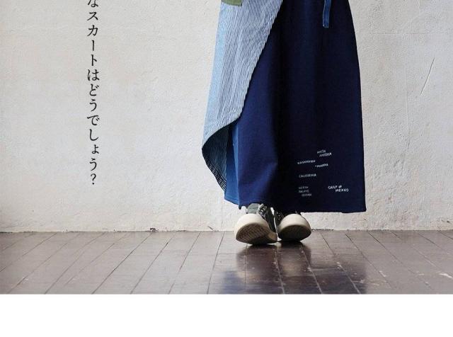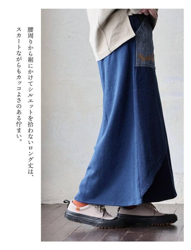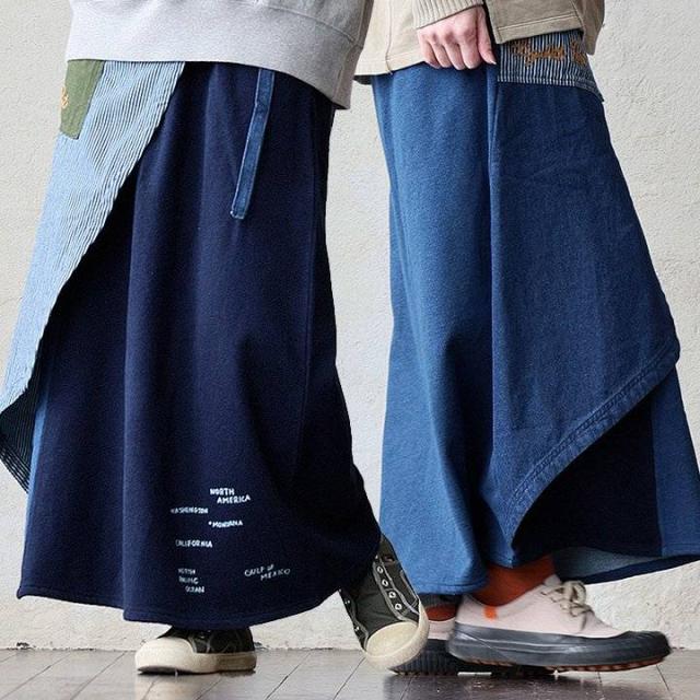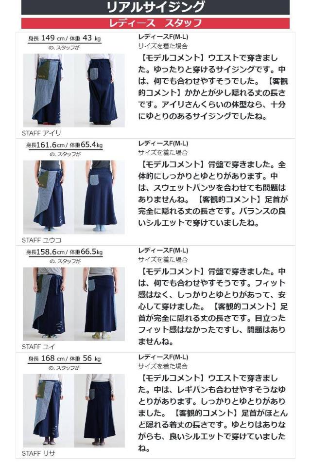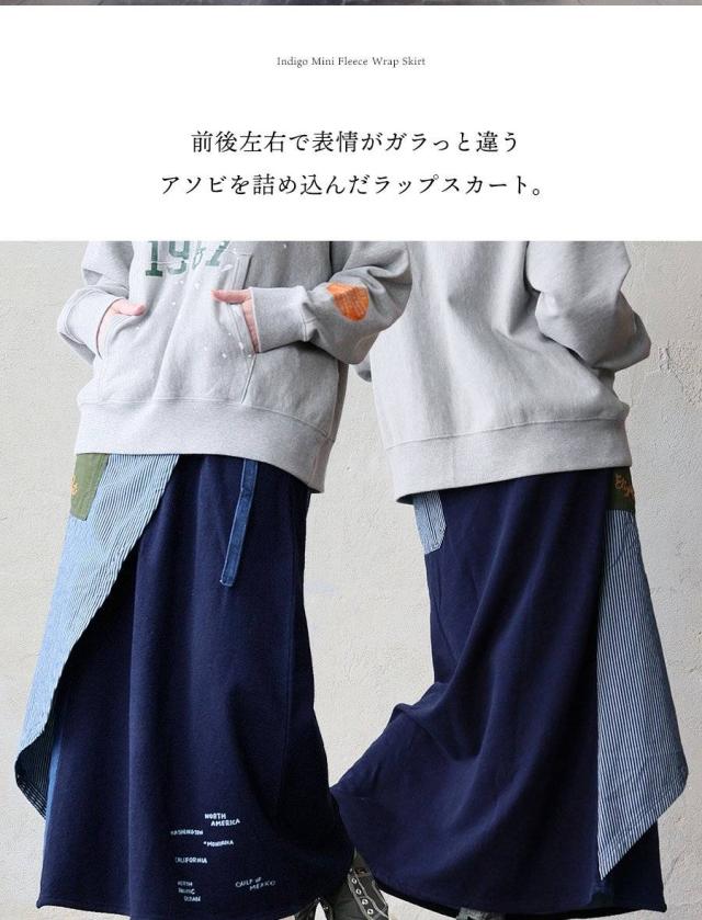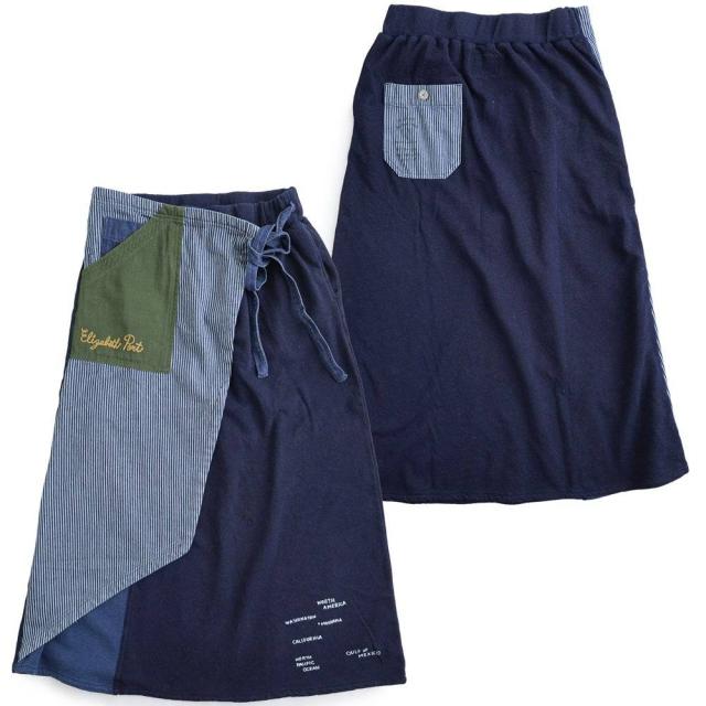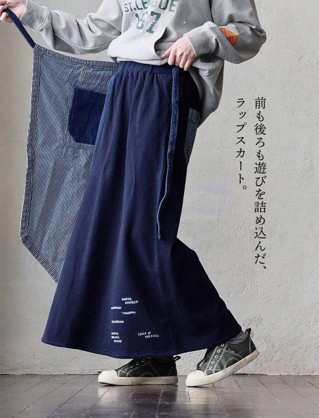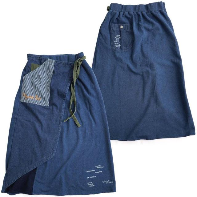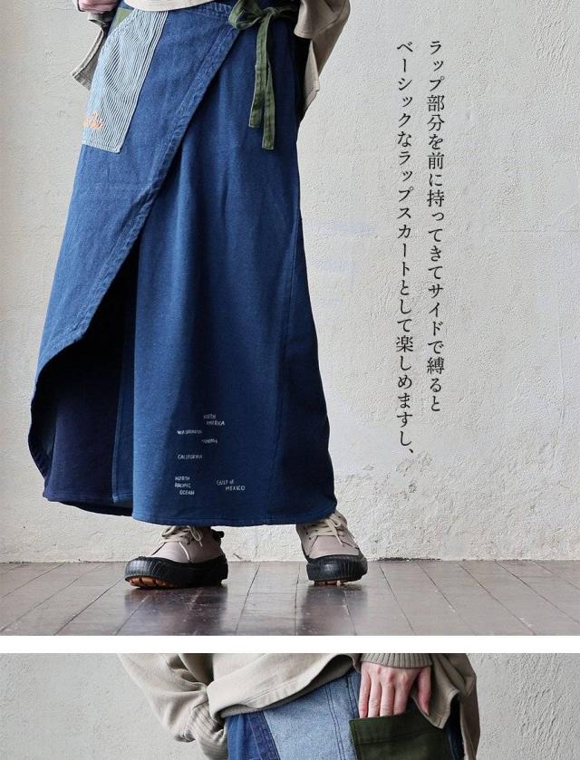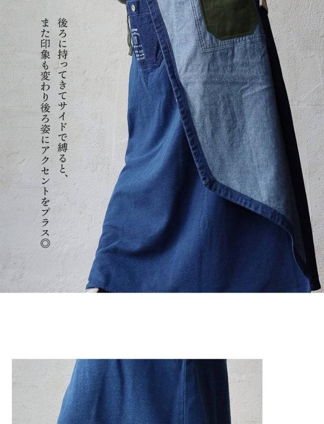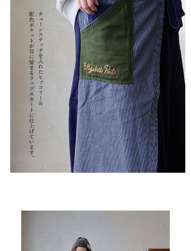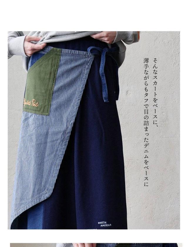 ・そんなスカートをベースに、薄手ながらもタフで目の詰まったデニムをベースにチェーンステッチを入れたヒッコリー&配色ポケットが目に留まるラップスカートに仕上げています。