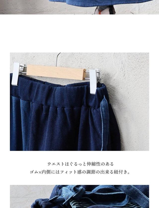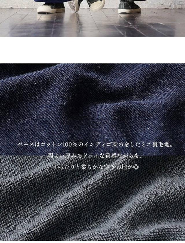 ・ベースはコットン100%のインディゴ染めをしたミニ裏毛地。程よい厚みでドライな質感ながらも、くったりと柔らかな穿き心地が◎