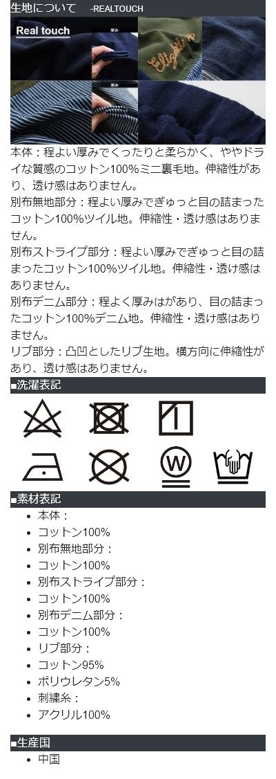 [素材]本体:コットン100% 別布無地部分:コットン100% 別布ストライプ部分:コットン100% 別布デニム部分:コットン100% リブ部分:コットン95% ポリウレタン5% 刺繍糸:アクリル100%