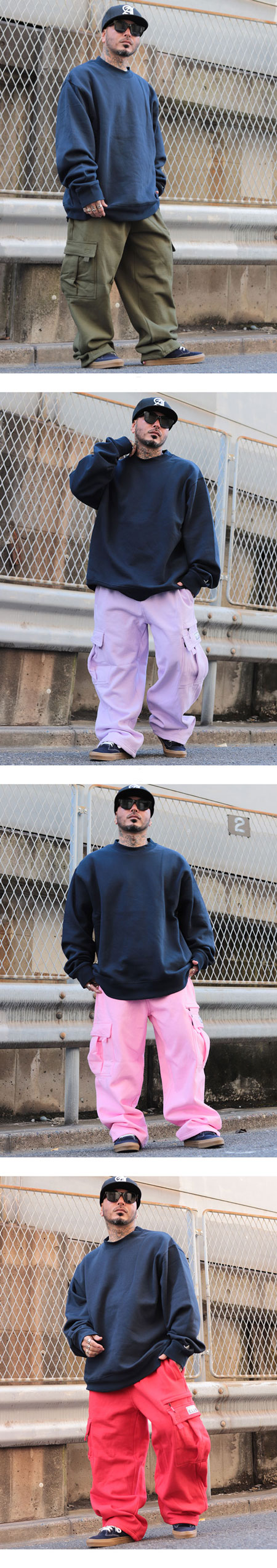 ※bボーイスタイルで着るため、モデルは通常Lサイズですが、2サイズアップの2XLを着用しています。