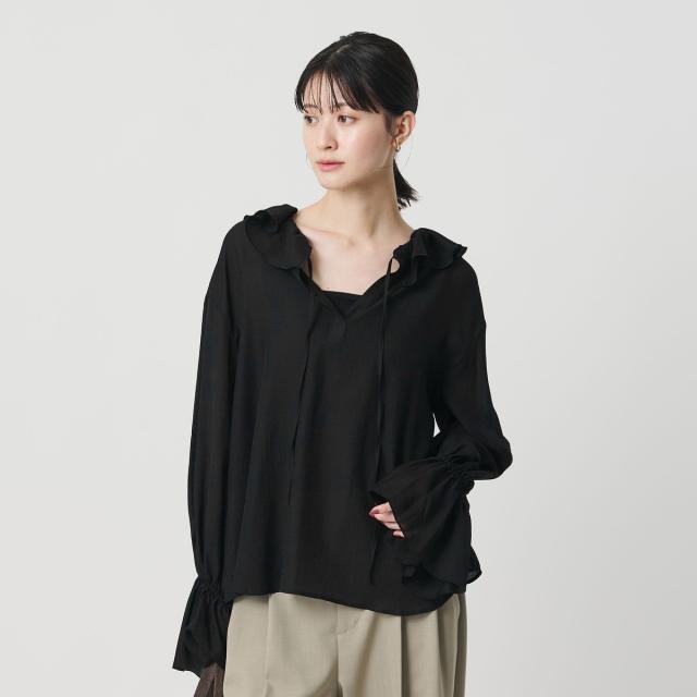 やわらかな透け感と動きのあるフリルが軽やかな印象と華やかさを添える一着です。