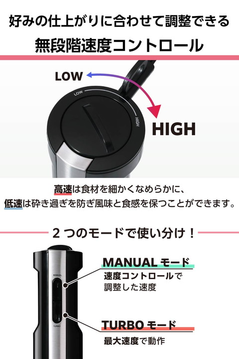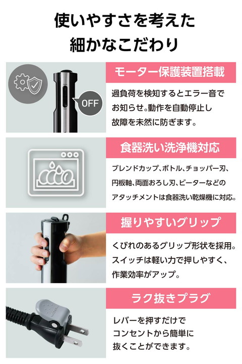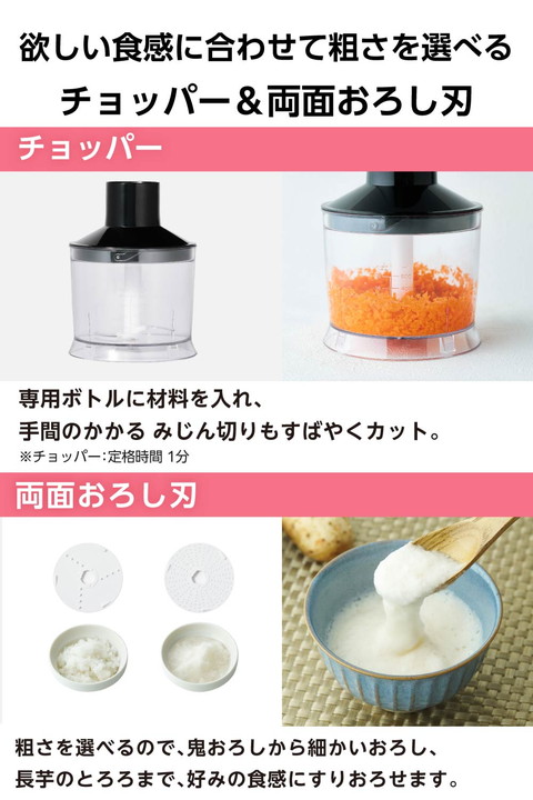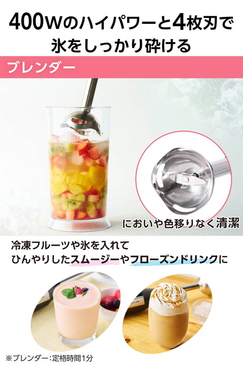 ハイパワーと速度コントロールで、仕上がりと食感を自在に操り、下ごしらえを短時間で効率化。できたてのおいしい瞬間が増え、毎日の調理がぐっとレベルアップするから、料理をもっと楽しめます。つぶす・まぜる・砕く・きざむ・おろす・泡立てるの「1台6役」。パワフルで多機能なハンドブレンダーです。![]() ■ブレンダーの「つぶす・まぜる・砕く」調理でスムージーやポタージュ、スープづくりがより簡単に。400Wのハイパワーモーターと、縦刃で大きな食材を砕き横刃でなめらかに整える4枚刃を採用。硬い氷や冷凍果実にも対応し、フローズンスムージーやシェイク、スムージーボウルなどの冷たいメニューまで本格的に楽しめます。さらにトマトソースやドレッシングもムラなく攪拌でき、仕上がりの質が上がります。 ■ブレンダーは氷をしっかり砕けるので、材料を入れて簡単にひんやりしたスムージーやフローズンドリンクが作れます。速度コントロールを使えば、シャリッとした氷感からとろりとなめらかな口当たりまで思いどおりに調整可能。自宅で手軽に、甘さや濃さ、トッピングまで自分好みに仕上げた“カフェ級の一杯”を楽しめます。 ■※氷は家庭用冷蔵庫の製氷機能で作った2.5cm角以下の角氷を100g以下で使用し、氷の分量(重さ)より多い分量の液体を入れブレンドカップを使用してください。 ■ブレンダーなら、冷凍果実を使って季節を問わず苺やマンゴー、ブルーベリーなどの濃厚なドリンクやデザートが簡単に作れます。牛乳やヨーグルト、ジュースなど少量の液体を加えるだけで、素材の冷たさと甘みをいかしたコクのある一杯に。冷凍果実は冷凍庫に常備しておけば必要な分だけ取り出して使えるので、思い立ったときにいつでも楽しめます。 ■※冷凍果実は2.5cm角以下のものを10個以下で使用し、100ml以上の液体を入れブレンドカップを使用してください。 ■チョッパーなら、手間のかかるみじん切りもあっという間に均一に仕上がります。専用ボトルに材料を入れて、そのまますばやく処理できます。 ■両面おろし刃で粗さを選べるので、鬼おろしから細かいおろし、長芋のとろろまで、好みの食感に仕上げられます。 ■バルーンビーターで生クリームのホイップもスピーディーに。メレンゲ作りもでき、お菓子作りの幅が広がります。 ■食材の状態や仕上がりの好みに合わせて速度を調整することで、狙いの食感に。高速でブレンドすると細かくなめらかに、低速では砕き過ぎを防いで粗めに仕上げ、風味と食感を保てます。本体上面のつまみを回して、好みの速度を無段階に調整できます。 ■効率よく材料をつぶす4枚刃は、鍋に直接入れられるのでスープ作りもお手軽に。金属製なので臭いや色移りなく清潔に使えます。 ■※鍋の中で使用の際の調理目安は、直径18cmの鍋に深さ3cmくらいの量です。飛び散りによるやけど防止のため、粗熱をとってからご使用ください。 ■容量700mlの目盛り付き専用ブレンドカップを付属。材料を量ってそのままブレンドでき、分量確認から仕上げまでスムーズに作れます。 ■握りやすい、くびれのあるグリップ形状を採用。人差し指と中指が自然に届くスイッチは軽い力で押しやすく、作業効率が向上します。上のスイッチ(Manual)は調整した速度で、下のスイッチ(Turbo)は最大速度で動作します。 ■ブレンドカップ、ボトル、チョッパー刃、円板軸、両面おろし刃、ビーターなどのアタッチメントは食器洗い乾燥機に対応していて、後片付けも簡単です。 ■※水温が70℃以上では洗えません。対応部品以外は食器洗い乾燥機を使用しないでください。 ■食材の入れすぎや定格時間を超えての連続使用など、過負荷を検知するとエラー音でお知らせします。動作を自動停止し故障を未然に防ぎます。 ■※動作が停止した場合は、電源プラグをコンセントから抜き、30分以上休ませてから使用してください。 ■調理中に片手がふさがっているときや、爪の長い方やネイルをしている方でも、レバーを押すだけでプラグを簡単に抜くことができます。 ■1.7mの電源コードで、コンセントの位置を気にせず、キッチンの好きな場所で使えます。コードが長めだから、無理に引っ張ったり絡まったりする心配も少なく、調理スペースを選びません。 ■使わないときはクイックコードバンドで電源コードをすっきりまとめることができます。 ■ブレンダー(つぶす・まぜる)で使えない材料:肉/魚/パン・ホットケーキなどの生地/食材以外のもの、【固いもの】市販の氷/2.5cm角を超える自家製の氷/冷凍した食材(2.5cm角以下の冷凍果実以外)/コーヒー豆/乾物(乾燥大豆・煮干しやかつお節)など、【ねばりけの強いもの】じねんじょ/いちょういも/山いも/つくねいも/やまといもなど、【水分の少ないもの】ゆでたいも類(じゃがいも・さつまいも など)/かぼちゃのマッシュなど ※ペーストにするときは、分量(重さ)の2/3以上の液体と混ぜる ■※ブレンダーの定格時間:1分 ■