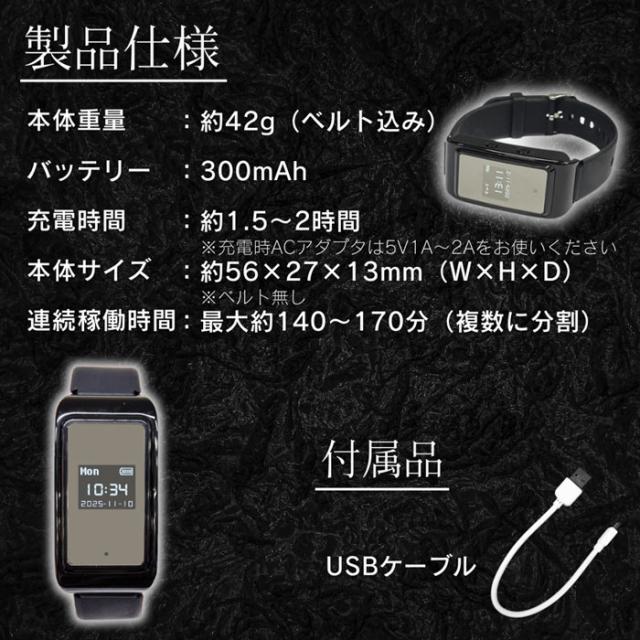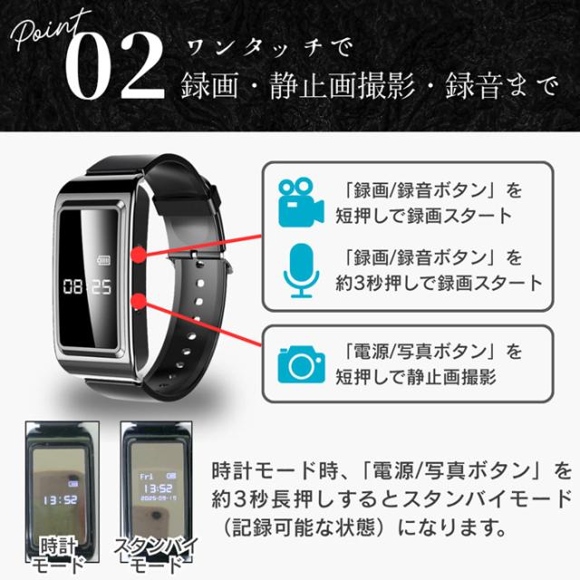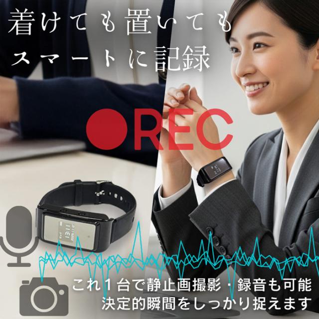 スタイリッシュなスマートウォッチ型で、高い隠蔽性を誇りカメラレンズが見えにくい為、プライベートからビジネスシーンまで様々な場所で活躍が期待出来ます。