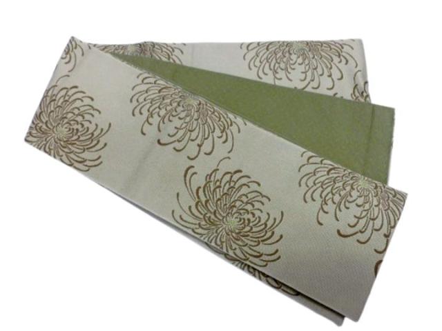 日本製 リバーシブル四寸帯 半幅帯 浴衣帯 半巾帯 細帯 着付け練習にも最適 結び帯 淡いグリーン地 乱菊 抹茶地 檜垣文柄 No.80