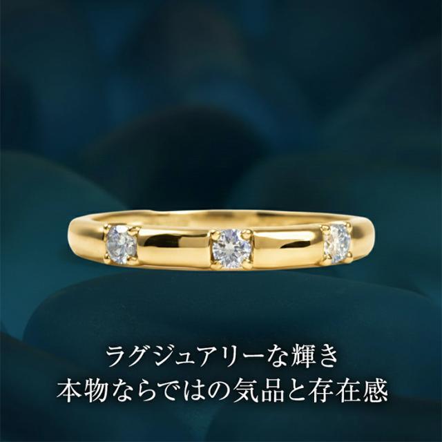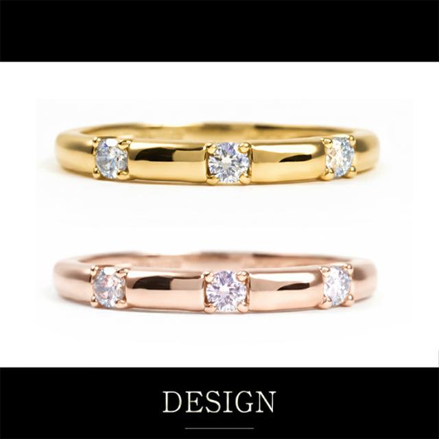 天然ダイヤモンド3石を配置したデザイン。女性の指を長く、細く見せてくれます。プロポーションの美しさだけでなく、光を最大限取り込み、つけ心地にもこだわりました。