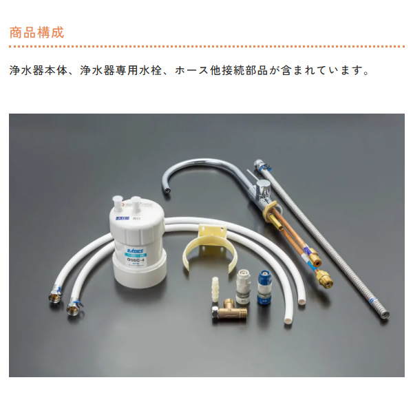 浄水器本体、浄水器専用水栓、ホース他接続部品が含まれています。