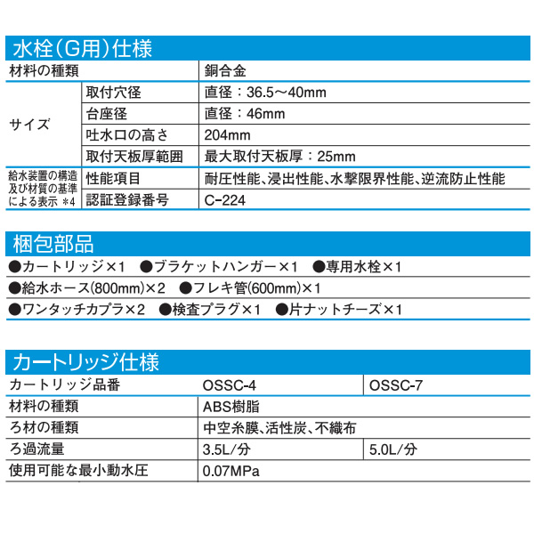 洗練されたシンプルなボディライン アンダーシンクII形浄水器 OSS-G4(カートリッジOSSC-4付) ●17+2物質を除去する高性能ろ過システム! 「日本産業規格(JIS S 3201及びJIS S 3201付属書A)」で定められた除去対象の17物質及び「浄水器協会規格基準」に定められた2物質すべてを、水のおいしさのもととなるミネラル分を残したまま除去します。 ●たっぷり使える大容量カートリッジで経済的に! さらに、面倒な交換も1年に1回で済むため経済的です。 ●フィルタ交換が容易なアンダーシンクII形 ●商品構成 浄水器本体、浄水器専用水栓、ホース他接続部品が含まれています。 ※取付けは取付工事専門業者にご依頼ください。 ※記載は商品仕様の一部です。仕様説明不足等の理由での返品はできません。特に適合等は必ずご確認ください。