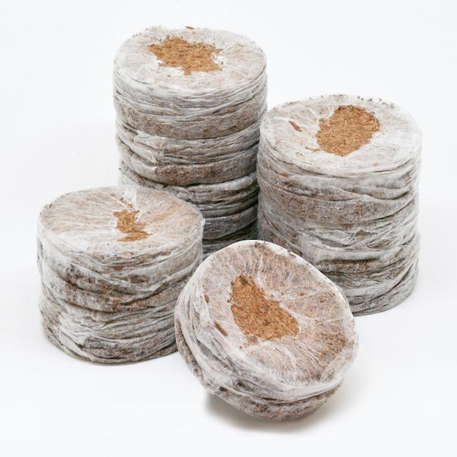 良質なココピート100%を不織布(PLA:生分解性プラスチック)で包んだものを乾燥・圧縮した育苗資材です。
