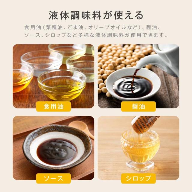 分解して洗える設計でお手入れも簡単。食用油はもちろん、醤油・ソース・シロップなど様々な液体調味料に対応します。