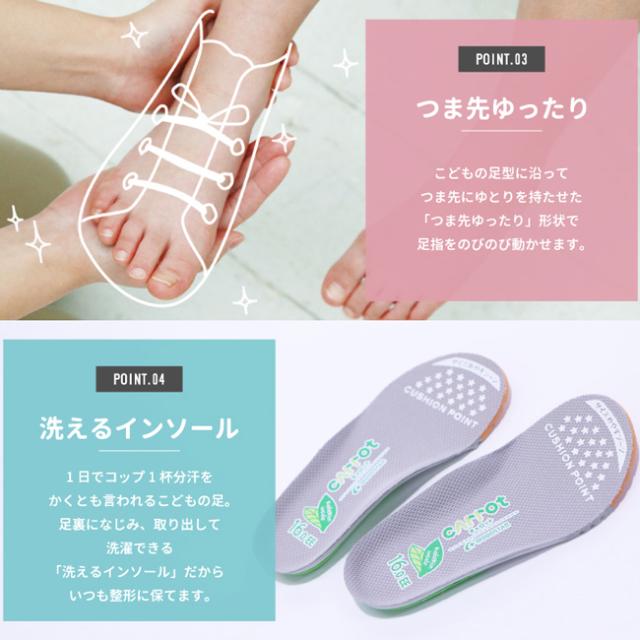 子どもの足の成長をサポートする「4つの機能(つま先ゆったり/カウンターボックス/フレックスジョイント/機能性カップインソール)」により、健やかな成長を促します。
