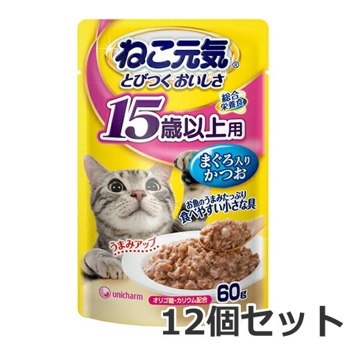 【メール便】12個セット ユニチャーム ねこ元気 15歳以上用 まぐろ入りかつお 60g×12個セット 総合栄養食 猫用 パウチ ウェットフード 送料無料