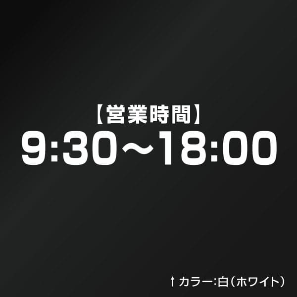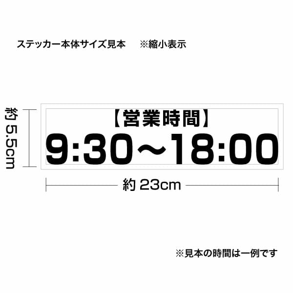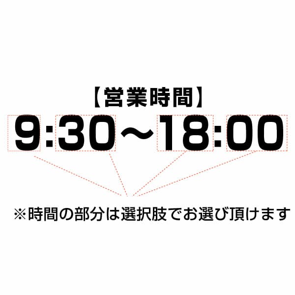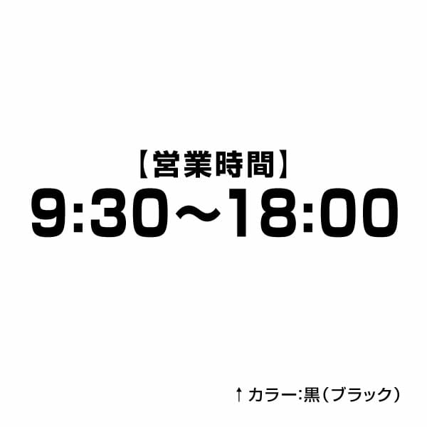 入り口のドアやウインドーなどに貼れます、時間部分をセミオーダーでカット致します。時間部分は選択肢より該当するものをお選び下さい。時間選択はお間違えのないように念入りにご確認下さい。文字数により調整(幅で合わせます)致しますので、レイアウトや文字バランスなどをあまり気にしない(当店におまかせして頂ける)お客様のみご購入下さい。ステッカーの材質は屋外看板用に使用されている耐光性・耐水性に優れた業務看板用シート(屋外耐候5-7年、条件による)です。万一貼付けに失敗しても安心の2枚組となります。すぐに貼れるように、アプリケーションシート(リタック)を貼って納品致します。※シート切り抜き作業等、1枚ずつハンドメイド品である事ご了承下さい。