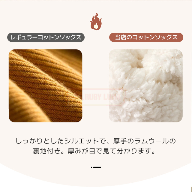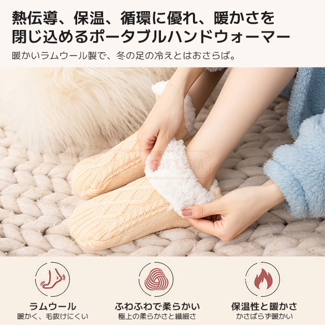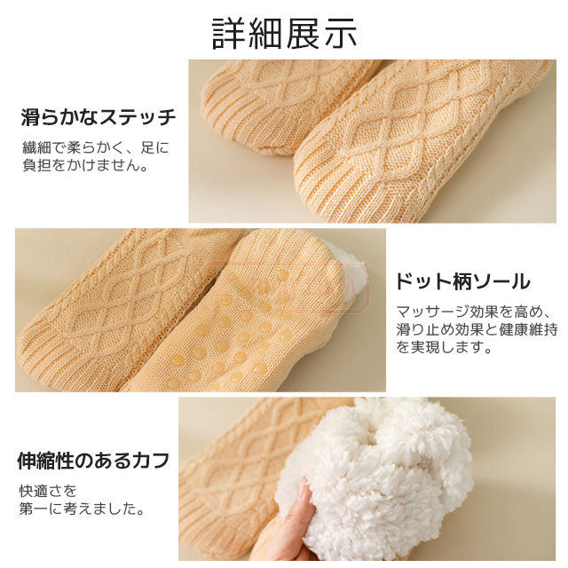 | 製品特徴 | ◆冬にぴったりな厚手の靴下で、足首やくるぶしまでしっかりカバーし、冷えがちな足元をぽかぽかに保ちます。肌触りがとても柔らかく、まるで毛布に包まれているような心地よさで、冷えやすい足元の冷え取りに最適です。 ◆リラックスできる暖かいルームソックスで、足元の冷え対策としてもおすすめです。 ◆足裏には滑り止めが付いており、家の中での歩行も安心。 ◆室内履きとしても活用でき、快適で安全な毎日をサポートします。 ◆内側はふんわりとした裏ポア素材を使用し、足先から足首、くるぶしまでの保温力が抜群。 ◆冷えやすい方や、夜もぽかぽかを維持したい方には、特におすすめの冷え取り靴下です。 ◆これ一足で、一日中快適な温かさを感じられます。 |