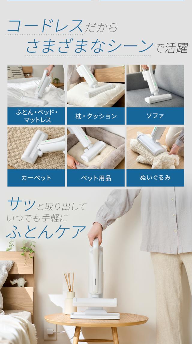 軽量+コードレスで簡単に持ち運びができるので、ふとんだけではなく、カーペット・ソファ・車の座席でも使用できます。