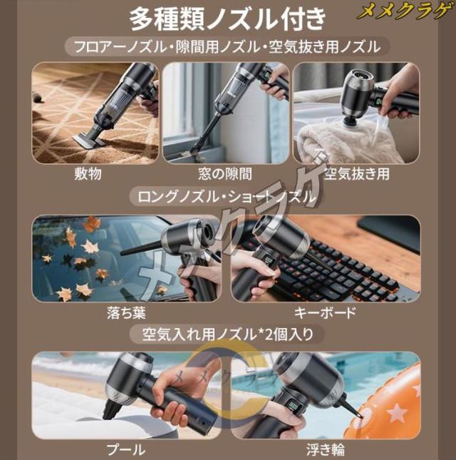 車載用掃除機が吸引と吹き出しの両方の機能を備えており、さらに7種類の吸引ノズルと吹き出しノズルが付属してます。ユーザーは、清掃の目的や要件に応じて各ノズルを選択して使用できます。これにより、車内のゴミやほこりの吸引だけでなく、エアコンや細かい箇所の吹き出しにも効果的に対応できます。ユーザーは必要に応じてノズルを組み合わせることで、より幅広い清掃ニーズに対応することができます