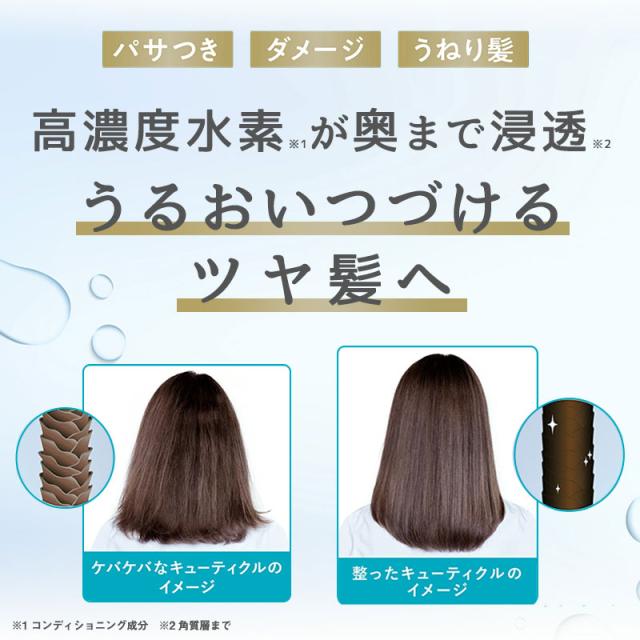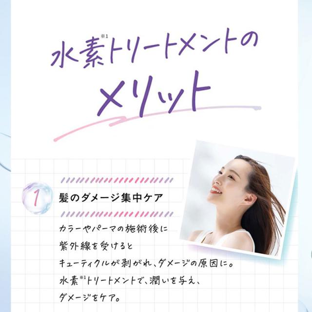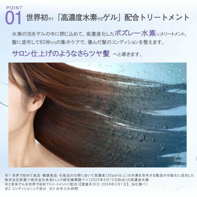 水素(*1)の泡をゲルの中に閉じ込め、高濃度化した自宅でできる水素(*1)トリートメント。髪に塗布してわずか60秒で傷んだ髪を補修し、サロン帰りのようなさらツヤ髪へ導きます。