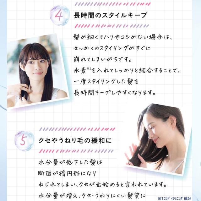 | 商品説明 | パサつき、ダメージ髪、うねり髪に。水素(*1)の泡をゲルの中に閉じ込めて高濃度化した、自宅でできる水素(*1)トリートメント。髪に塗布して60秒の集中ケアで傷んだ髪を補修し、サロン仕上げのようなさらツヤ髪へ。 ●水素(*1)×植物由来成分(*2)&ケラチン(*3)×髪の美容成分(*4) ●ツヤ髪・ダメージ補修・うねりケア・保湿に *1 コンディショニング成分 *2 スクレロカリアビレア種子油、ホホバ種子油、アルガニアスピノサ核油 *3 ラウルジモニウムヒドロキシプロピル加水分解ケラチン(羊毛)、加水分解ケラチン(カシミヤヤギ) *4 ゼイン、サガラメエキス、ジラウロイルグルタミン酸リシンNa(*2〜*4:保湿成分) ※パッケージデザイン等は予告なく変更されることがあります |