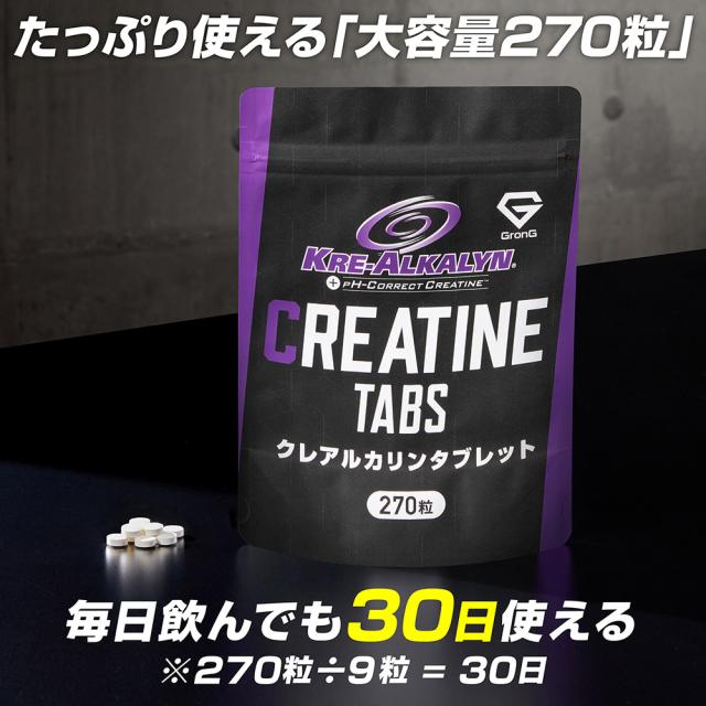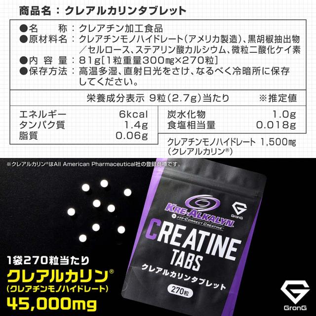 グロング クレアチン モノハイドレート クレアルカリン タブレット 270粒 約30日分 国内製造 GMP認定工場製造 バイオぺリン配合