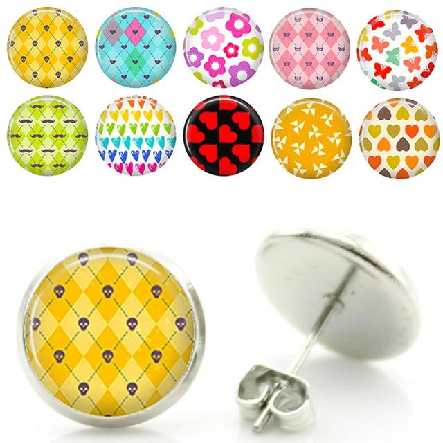カラフルなアーガイル模様やハートやフラワーや蝶々など可愛いデザインの14mmカボションをサージカルステンレス316L製のポストにセットしたステンレスピアスです。