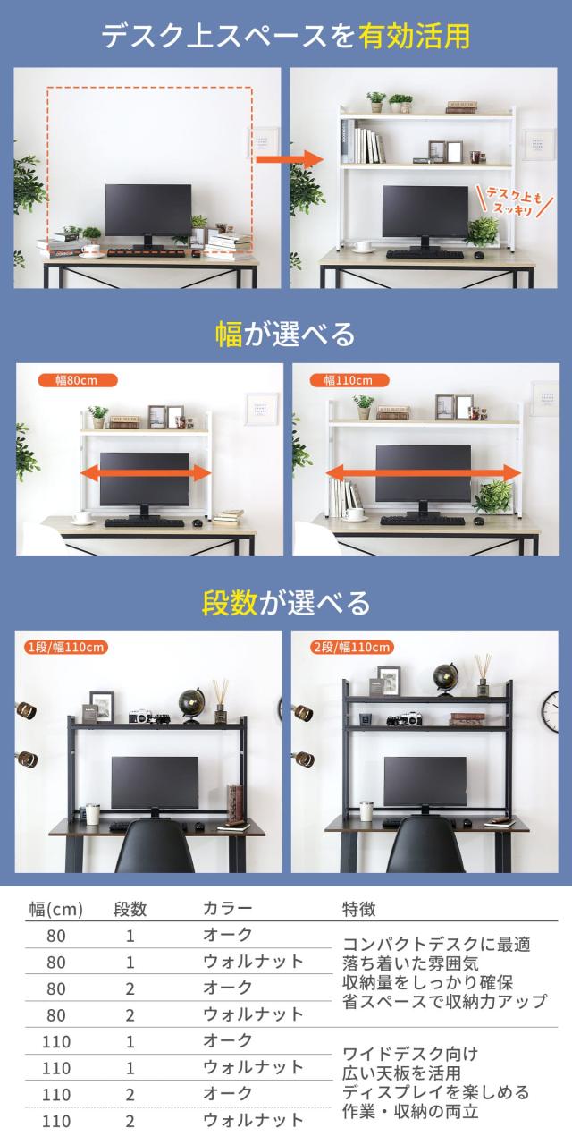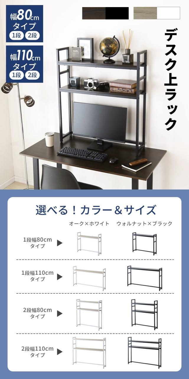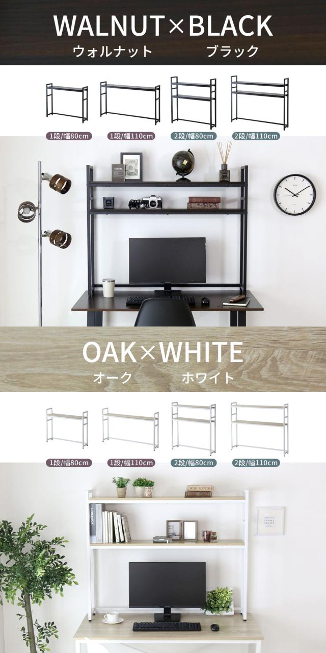 お部屋のテイストやデスクの色味に合わせて選べる2カラー展開。「ウォルナット棚板×ブラックスチール」「オーク棚板×ホワイトスチール」をご用意しました。さらに幅80cm・110cmの2サイズ、棚板1段・2段から選べ、使う場所や用途に柔軟に対応します。