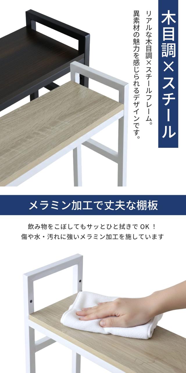 温かみのある木目調棚板と、シャープなスチールフレームを組み合わせた異素材デザイン。無駄を省いたシンプルなフォルムで、オフィスにもご自宅にも違和感なくマッチします。棚板表面にはメラミン加工を施し、傷や汚れに強くお手入れも簡単です。