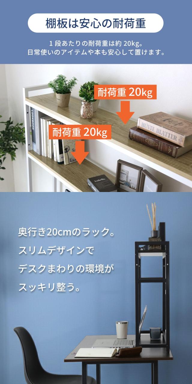 棚板は耐荷重20kgの安心設計で、周辺機器や書籍、収納ボックスもしっかり支えます。たわみにくく安定感のある使い心地を実現。奥行20cmのスリム設計のため、圧迫感を抑えながら収納力を確保し、デスク上をすっきり整えます。