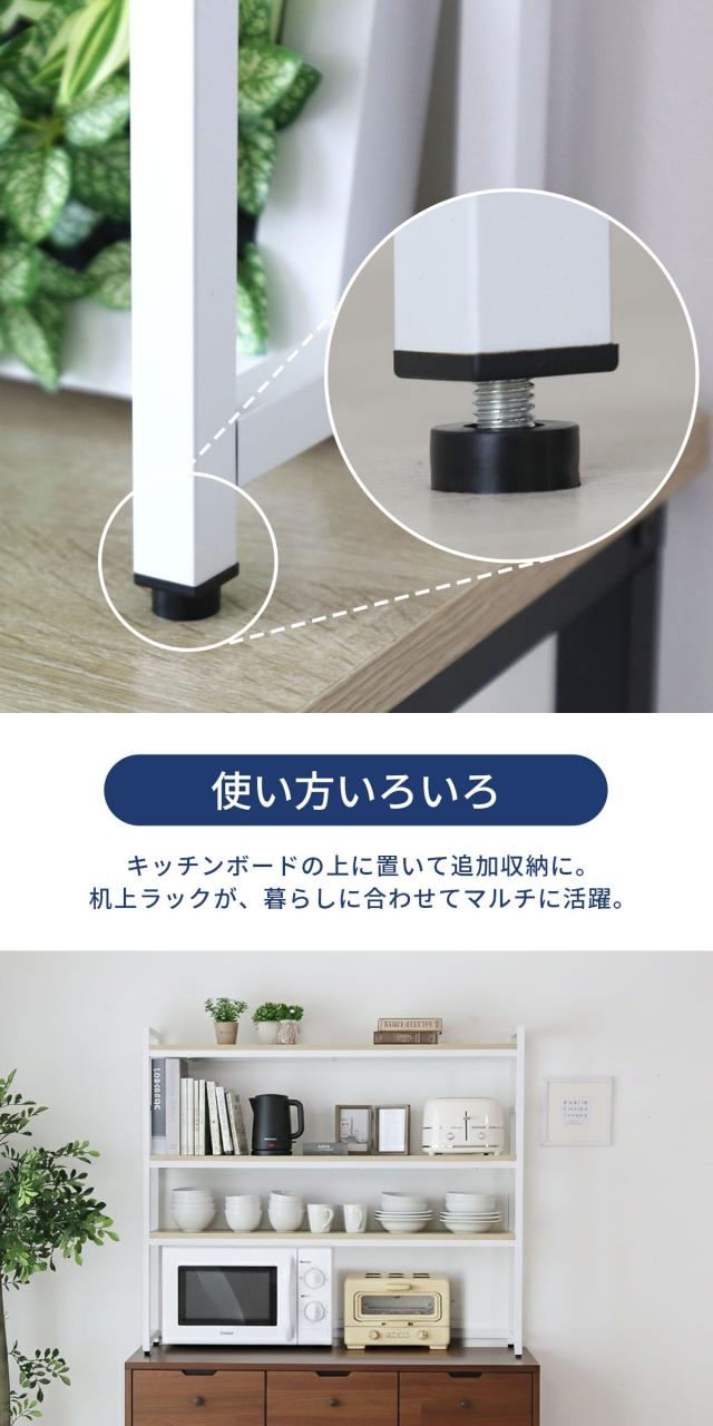 脚部にはアジャスターを搭載し、設置場所のわずかな段差や傾きを調整可能。がたつきを防ぎ、安定した使用感を保ちます。デスク上はもちろん、パウダールームやキッチンの収納ラックとしても活躍し、限られた空間を無駄なく使えます。