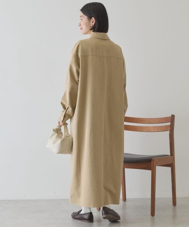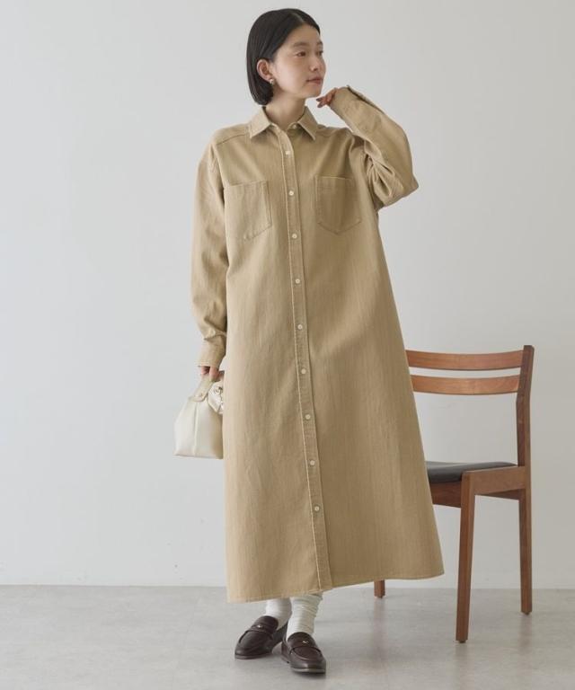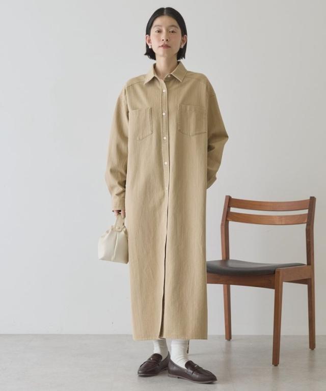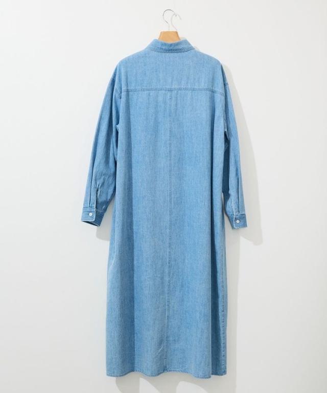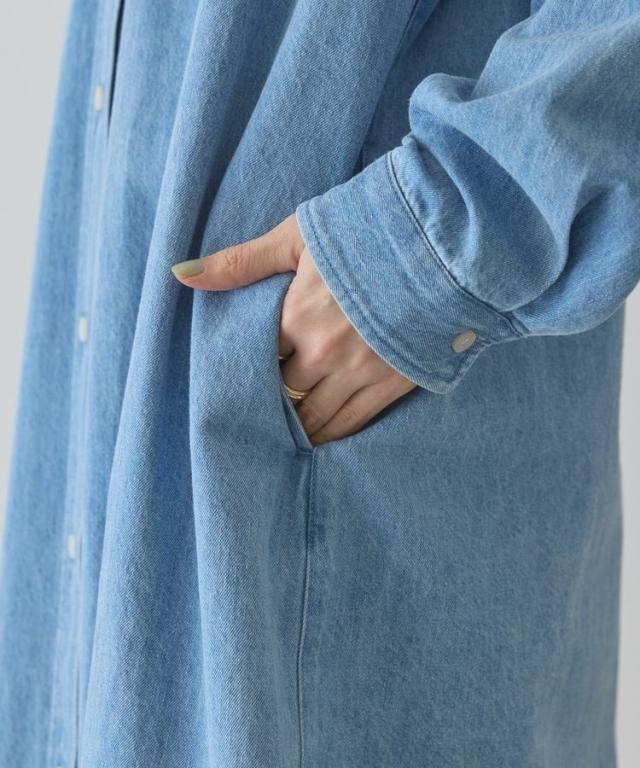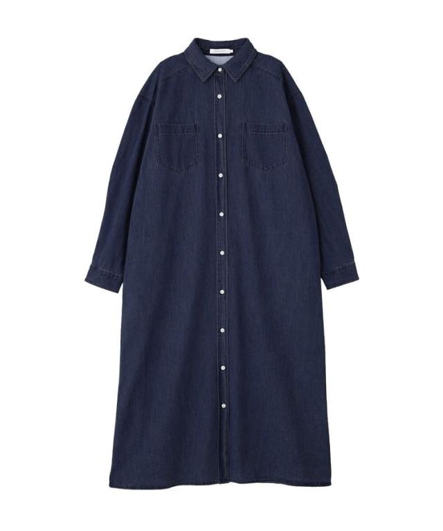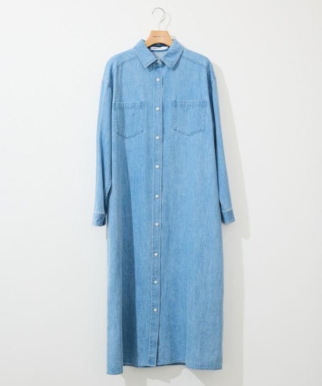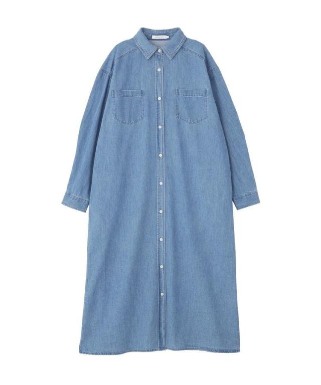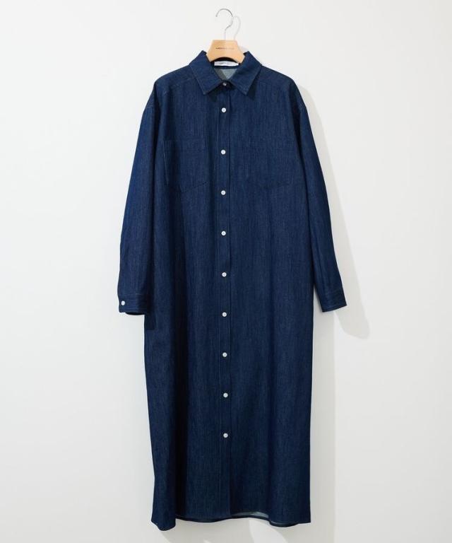 長めの着丈とクリーンなデザインでカジュアル過ぎない上品さを演出するデニムワンピース。
