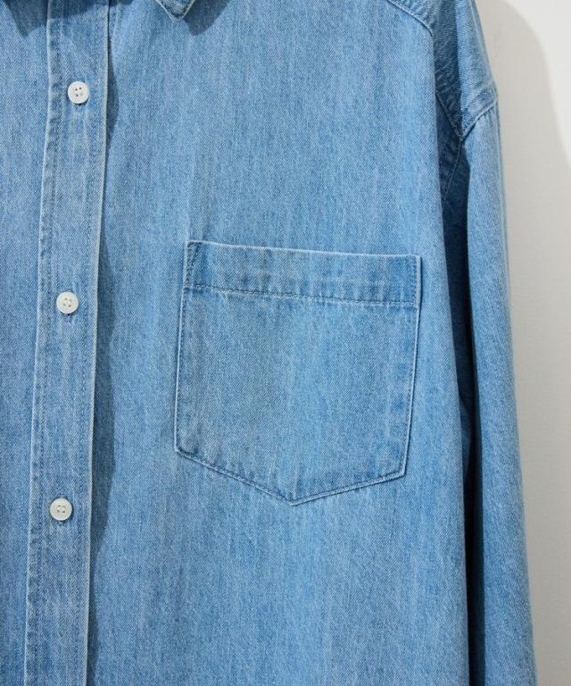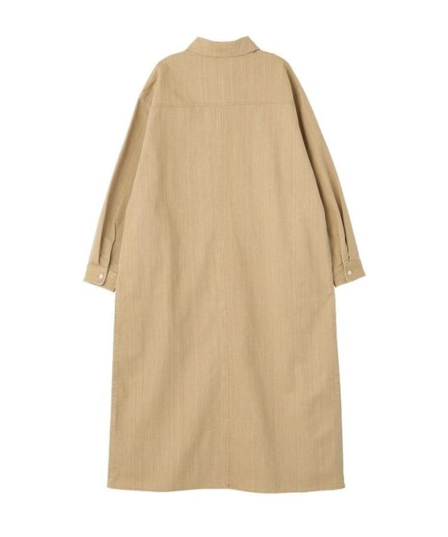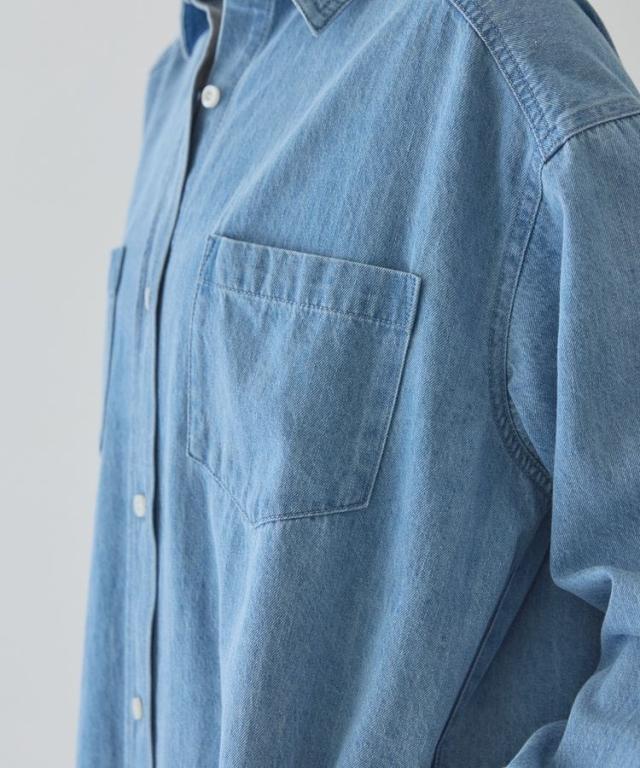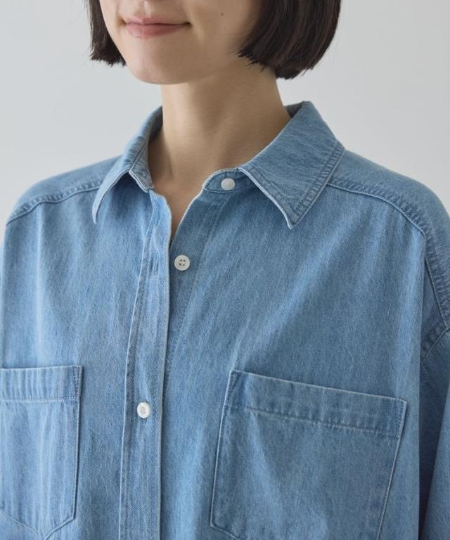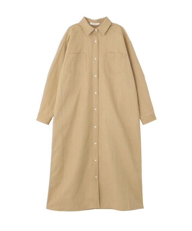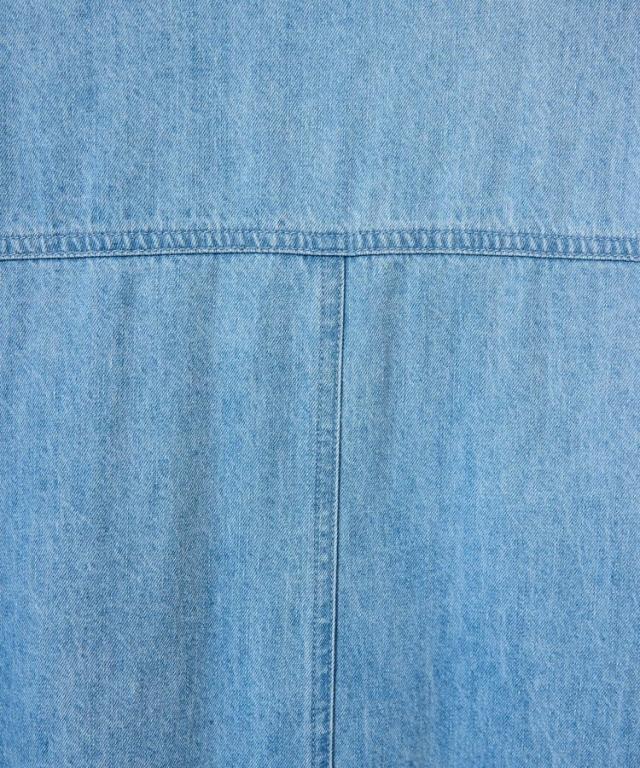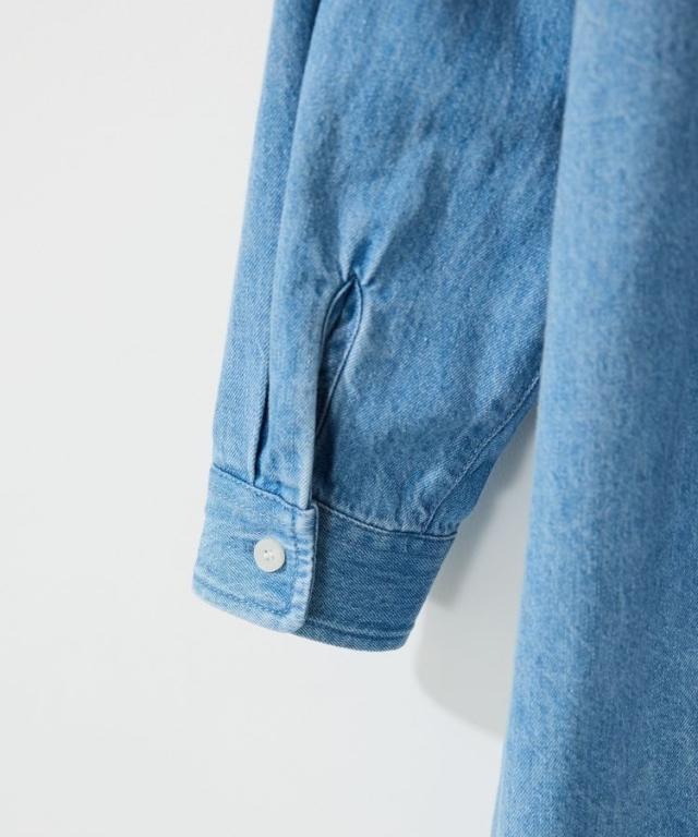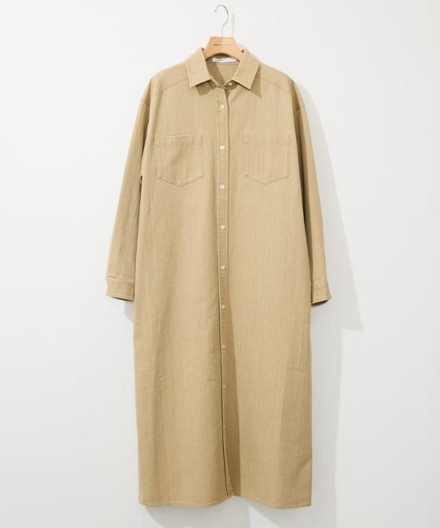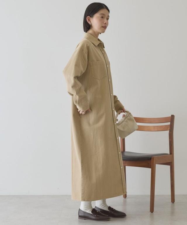 長めの着丈とクリーンなデザインでカジュアル過ぎない上品さを演出するデニムワンピース。