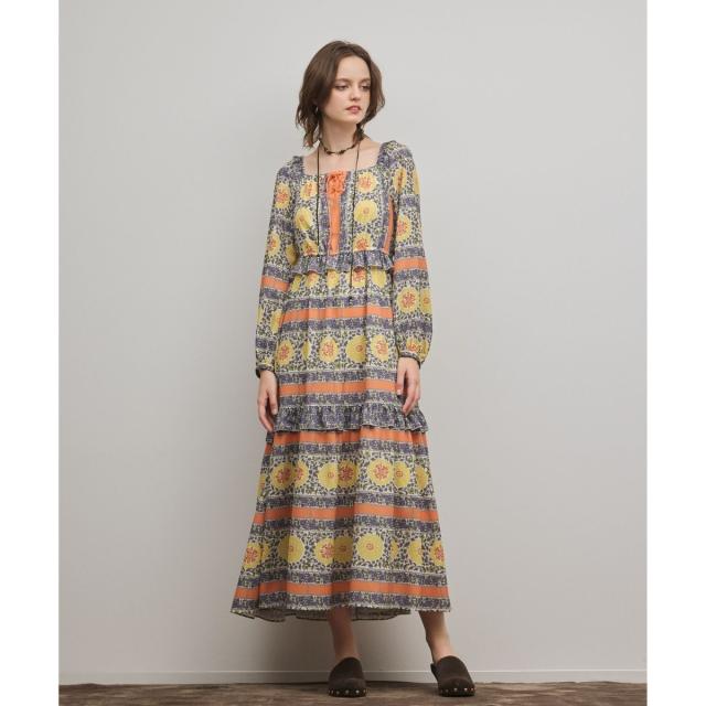 落ち感のあるパウダーデシンにボーホーのムードが漂うキカフラワープリントを施したティアードのワンピース。胸元のレースアップもポイント。