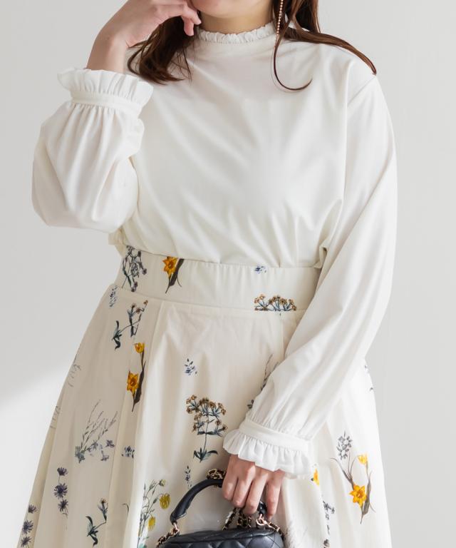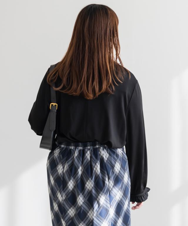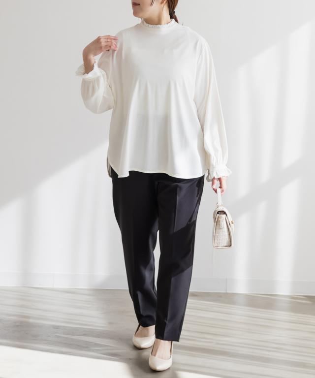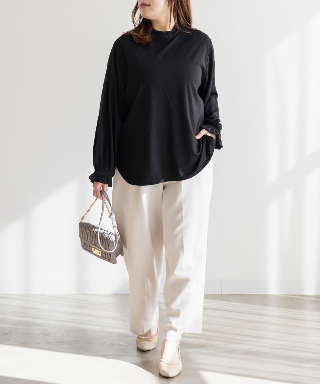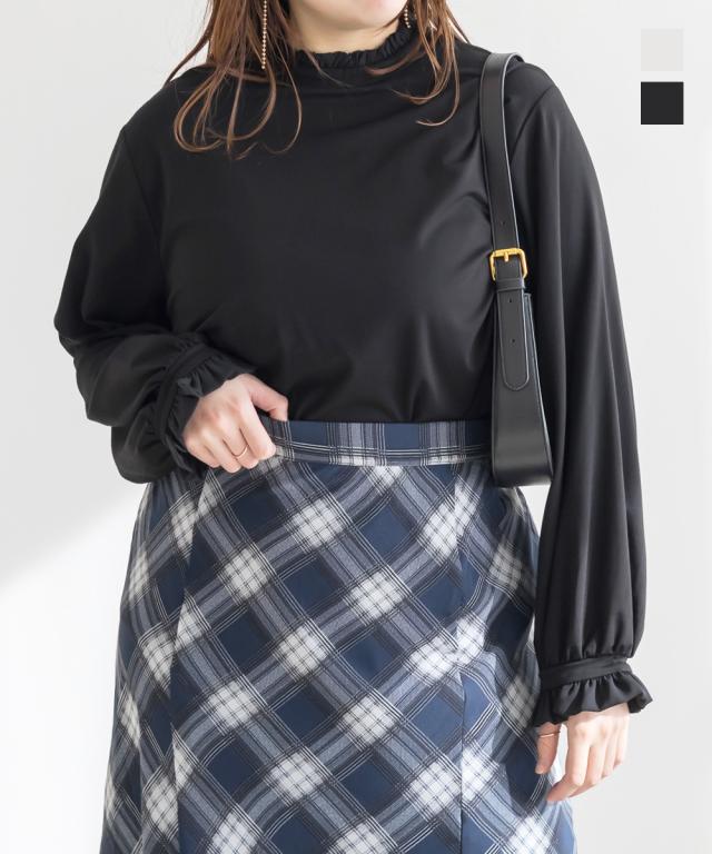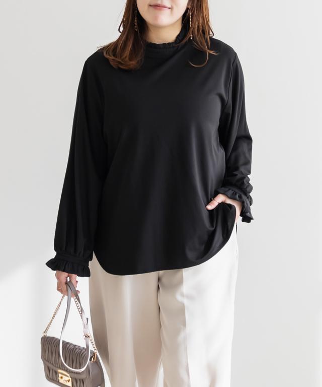 | 3Lサイズを着用しました。身幅や肩まわりにほどよくゆとりがあり、いつものカットソーと比べても窮屈感なく着られました。プチハイネックのフリルデザインですが、首まわりに締め付け感がなく、顔まわりをやさしく華やかに見せてくれるのが嬉しいです。柔らかな素材感で肌当たりもよく、長時間着てもストレスフリーな着心地でした。1枚で着ても可愛いですし、ジャンスカやキャミワンピのインナーとして合わせるのもおすすめ◎ きれいめにもカジュアルにも使いやすく、デイリーからお仕事やハレの日まで幅広く活躍してくれそうです♪ |