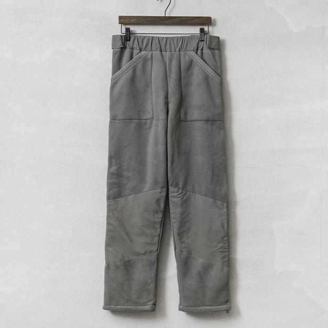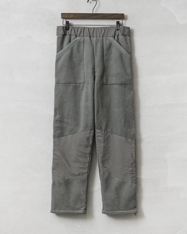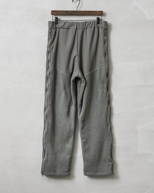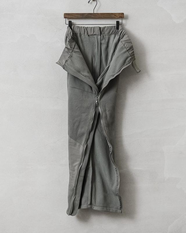 サイド部分の全開放、裾の部分だけを開けて着用するなどスタイルに合わせて変化させることができます。ブーツなどの履物を脱がずに着脱できる機能的なデザインです。単体での着用はもちろん、ハードシェルパンツとの組み合わせでライナーとして使用することで防寒性を高めたレイヤリングが可能です。民生品ではありますが、官給品のフリースライナーよりも使い勝手の良い厚手のパンツタイプで、軍内部でも転用されていたものと思われます。