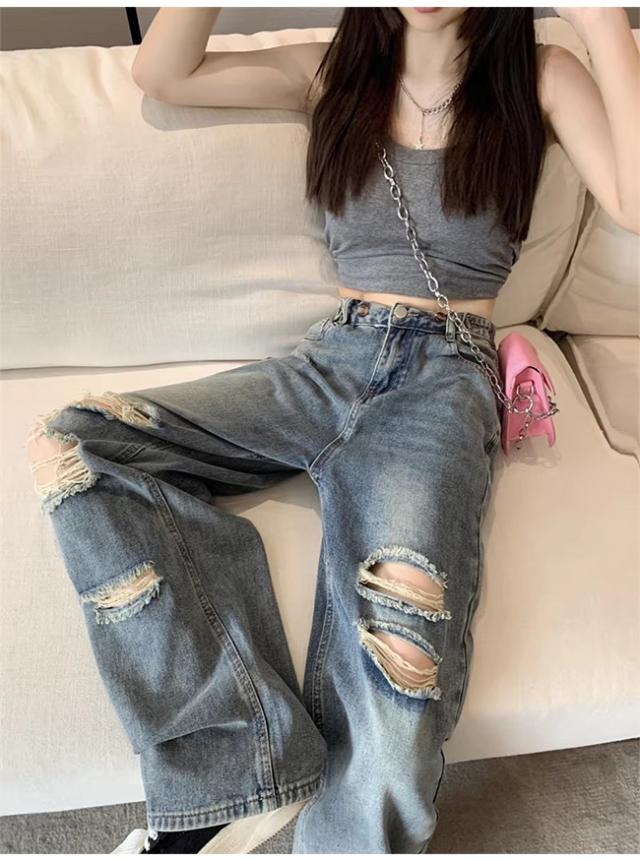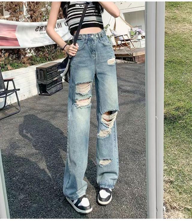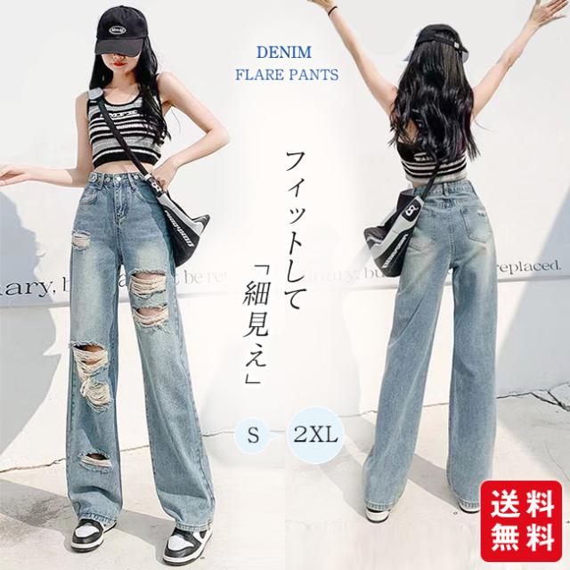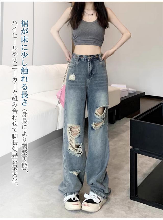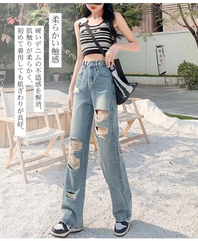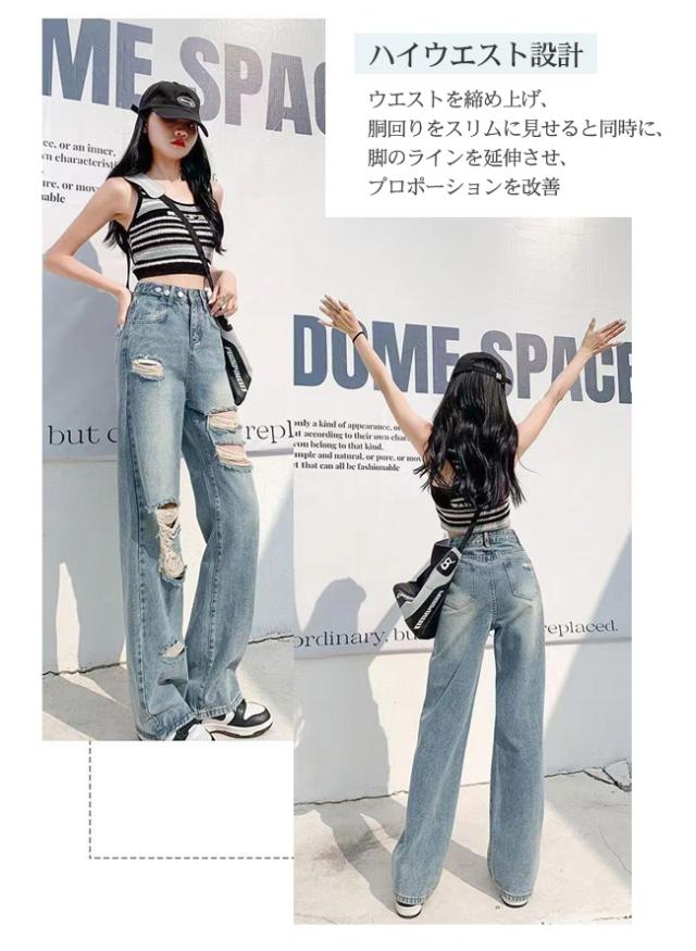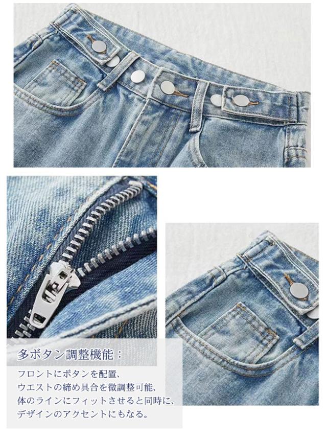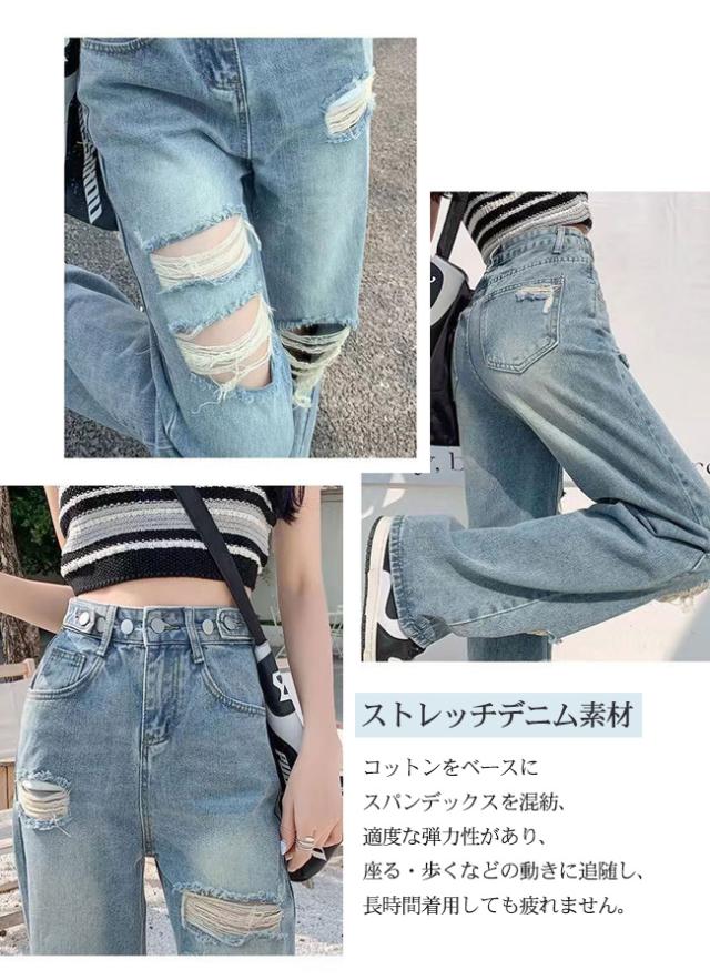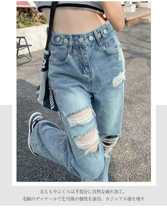 ダメージジーンズ デニムパンツ レディース ハイウエストワイド 多ボタン オールマッチ リラックス かっこいい ジーンズ マルチホック調整可能