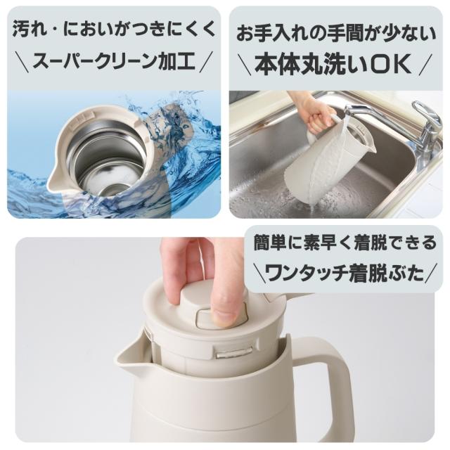 | 商品名: タイガー魔法瓶 真空断熱ステンレスポット PWR-A160 ステンレスポット 1.6L 保温 保冷 食洗機対応 真空断熱 魔法瓶 コーヒーポット お茶ポット キッチン ダイニング オフィス用 -商品説明- 真空断熱ステンレスポット PWR-A160 スタイリッシュなデザイン性と使いやすさを追求したステンレスポット ----- インテリアに調和するスタイリッシュなフォルムとカラー ----- 真空断熱構造で保温・保冷力が高く、飲み物を最適の温度に保つステンレスポット。 どの空間にも合うカラーラインアップで、場所や時間を選ばずお好きな飲み物を楽しめます。 ----- ワンタッチ着脱ふた ----- 簡単に素早く着脱できるワンタッチふたを採用。 手指の大きさにかかわらず開閉レバーがつまみやすいよう、すっきりとしたデザインに仕上げました。 ----- 注ぎやすいプッシュレバー ----- ----- 真空断熱でしっかり保温・保冷 ----- 軽くて丈夫なステンレス製の真空二重構造により、高い断熱効果を発揮し、温かい飲み物は温かいまま、冷たい飲み物は冷たいまま、温度を長時間保ちます。 例えば、朝入れたコーヒーやお茶はお昼になっても飲みごろ温度をキープ。 電気を使わず省エネで、ダイニングやリビングでゆっくりと飲み物を楽しめます。 ----- 汚れやにおいがつきにくい「スーパークリーン加工」 ----- 毎日使うものとして清潔性とお手入れのしやすさにこだわりました。ポットの内面には、なめらかで光沢のあるスーパークリーン加工を施しました。 汚れやにおいがつきにくく、さっと洗うだけで、いつも清潔にお使いいただけます。 ----- 食器洗い乾燥機 OK ----- 中せん・本体ともに食器洗い乾燥機に対応。 お手入れがさらにらくになりました。 ※せんと本体ははずして入れてください。 ----- 汚れやにおいがつきにくい「スーパークリーン加工」 ----- カップの内面には、なめらかで光沢のあるスーパークリーン加工を施しました。 汚れもニオイもつきにくく、さっと洗うだけでいつでも清潔です。 ※使用後はすぐに水ですすぐなど、お手入れしてください。 ----- 広口でお手入れしやすい ----- 手を入れやすく、内側までしっかり洗えます。 本体丸洗いOK! 分解パーツが少なく、組み立てもかんたん -特徴・品質- ・保温・保冷に優れたステンレス製真空二重構造 ・インテリアに映える洗練されたカラーとシンプルなデザイン ・スーパークリーン加工により、におい・汚れがつきにくく清潔を保てる ・本体丸洗い可能で、パーツが少なく組み立ても簡単 -仕様- ・カラー / JANコード: クラウドブルーAL / 4904710444078 イーグレットホワイトWK / 4904710444085 マットステンレスXM / 4904710444061 ・容量:1.6L(1600ml) ・保温効力(10時間):73℃以上 ・保冷効力(10時間):8℃以下 ・サイズ:約13.1×17.6×25.6cm ・質量:約0.8kg ・口径:約7.5cm ・生産国:中国 ・型番:PWR-A160 ※ 保温効力とは、室温20度±2度において、製品に熱湯を満たし、湯温が95度±1度の時から10時間放置した場合におけるその湯の温度です。 ※ 保冷効力とは、室温20度±2度において、製品に冷水を満たし、水温が4度±1度の時から10時間放置した場合におけるその水の温度です。 -機能- ・真空二重構造で高い保温・保冷性能を実現 ・プッシュレバーで注ぎやすく、毎日の使用に便利 ・中せん・本体ともに食洗機対応で、手間のないお手入れ ・シンプルで高級感のあるデザインが、家庭や職場の空間に調和 -使用・手入れについて- ・使用後は速やかに水ですすいでください(特にお茶・コーヒー使用後) ・食洗機使用時は中せんと本体を分けてご使用ください ・漂白剤や強い洗剤は使用しないでください ・内容物の温度によっては、やけどにご注意ください -注意事項- ・商品の色はできる限り実物に近づけていますが、ディスプレイ設定や撮影条件により色味が異なる場合があります。ご了承ください。 ・ご注文のタイミングや内容により、購入後のキャンセルや修正が制限される場合があります。 ・同時に複数のご注文があった場合、システム上の遅延により在庫がないにも関わらず購入できてしまう場合があります。そのような場合は速やかにメールでお知らせいたします。 |
