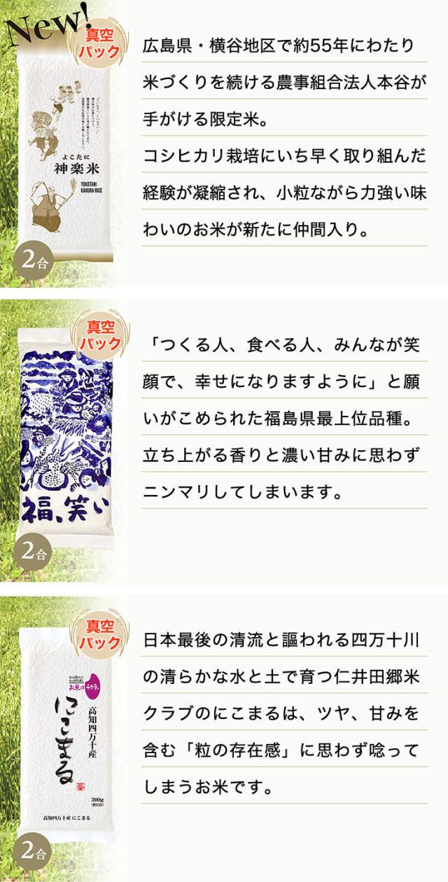 オコメール 祝いの縁起米3種食べ比べセット 広島産 よこたに神楽米(コシヒカリ)+ 高知産 にこまる+ 福島産 福、笑い 300g(2合) × 3パック 真空パック【白米・ゆうパケット便送料込】お米 令和7年産 2025年産
