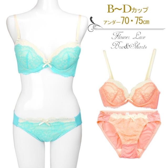フラワーオーバーレース ブラジャー ショーツ 上下セット 下着 (9058) ターコイズ ピンク B C D 70 75 bs2452