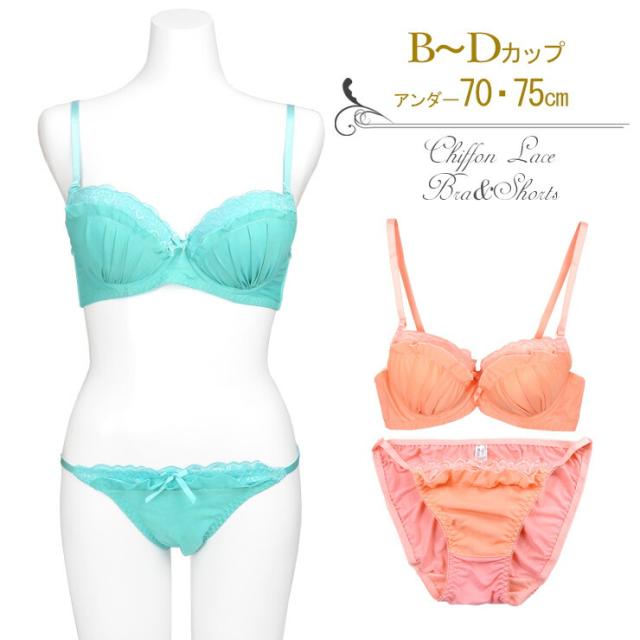 シフォンレース ブラジャー ショーツ 上下セット 下着 (9066) ターコイズ ピンク B C D 70 75 bs2454