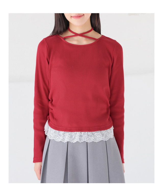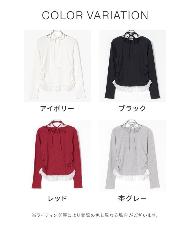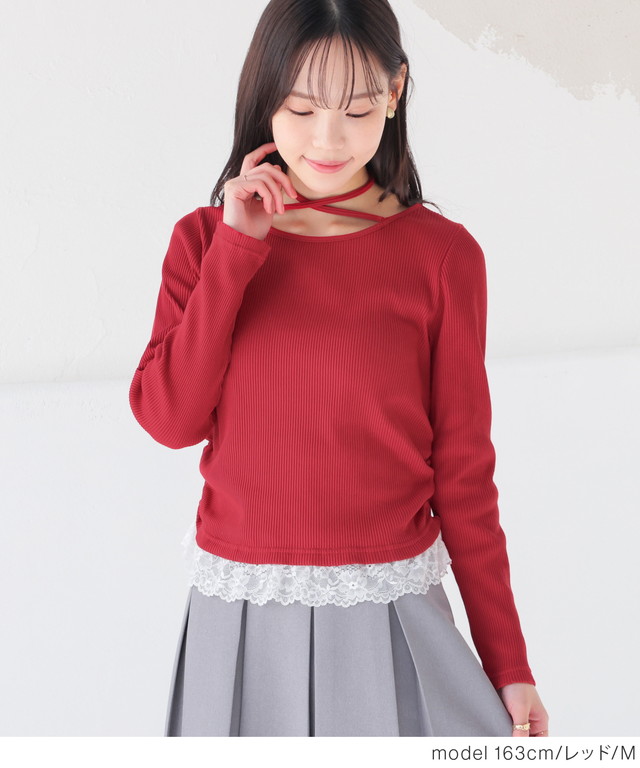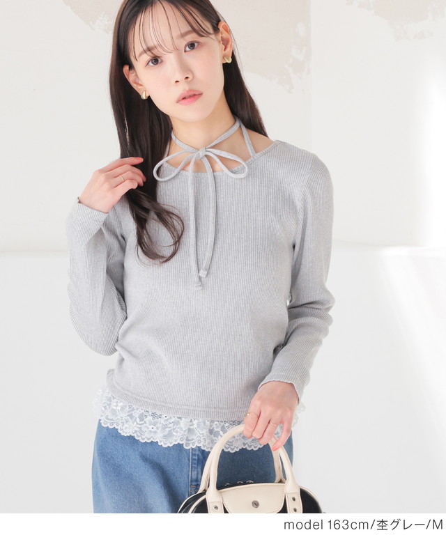 ホルターネックとして後ろで結んでも、チョーカー風に前で結んでも使えるリボン付きトップスの裾にレースを付けた、1枚で簡単にトレンドのレイヤード風コーデが完成するデザイン。