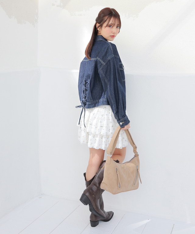 王道カジュアルにフェミニンムードをプラスする、バックレースアップデザイン。
