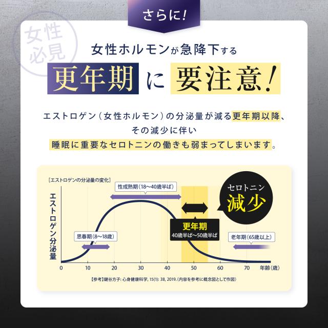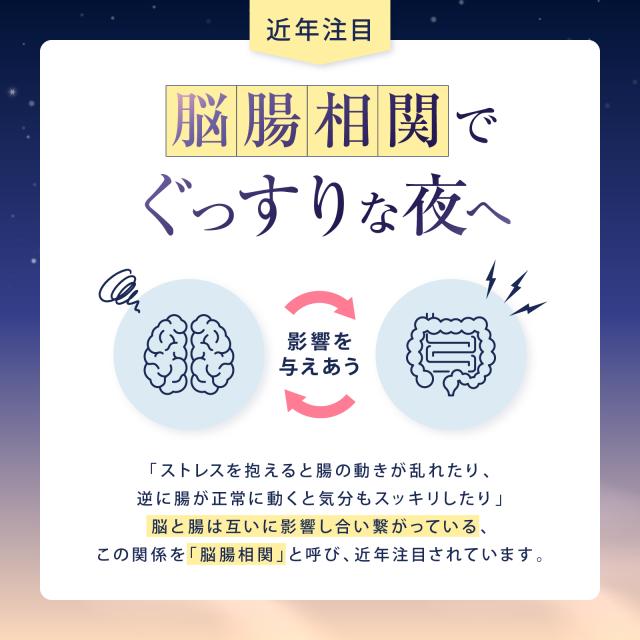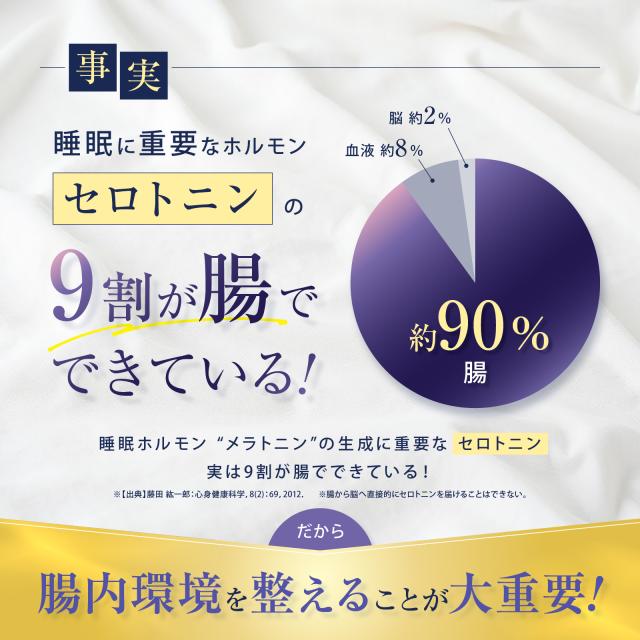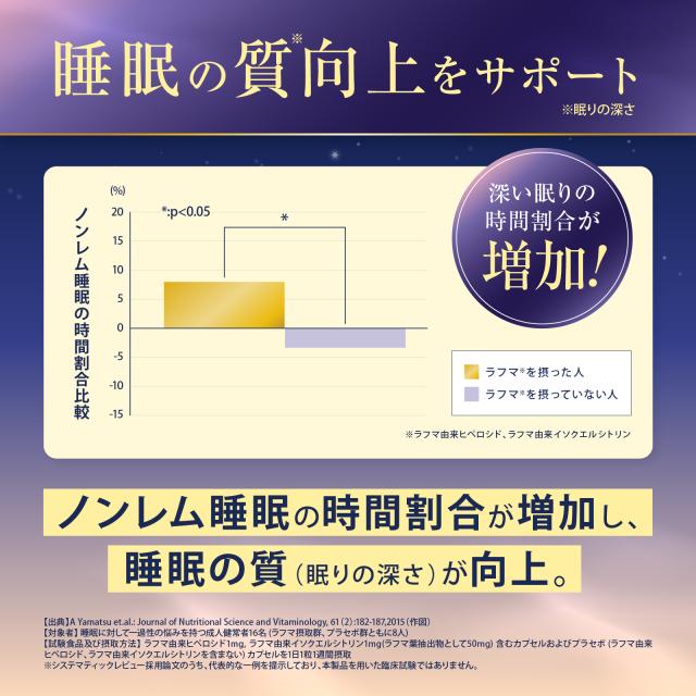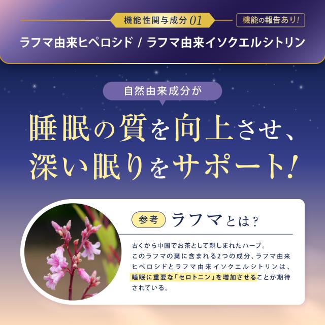 | 届出表示 | 本品にはラフマ由来ヒペロシド、ラフマ由来イソクエルシトリン、植物性乳酸菌K-1(L.casei 327)が含まれています。ラフマ由来ヒペロシド、ラフマ由来イソクエルシトリンには睡眠の質(眠りの深さ・起床時の睡眠に対する満足感)の向上に役立つことが報告されています。植物性乳酸菌K-1(L.casei 327)にはおなかの調子を整えてお通じを改善する機能が報告されています。 |