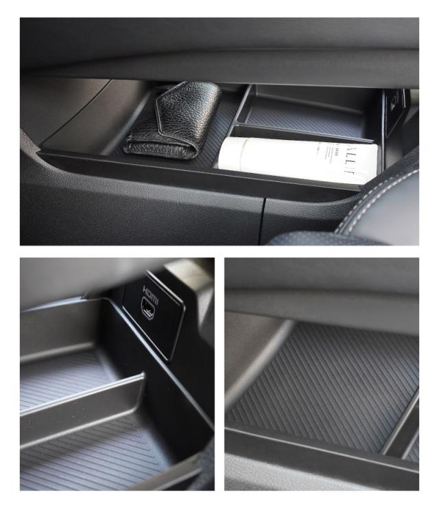 深くて使いづらい純正収納スペースを仕切ることで、スマートフォン・小銭・カード類・鍵などの小物をすっきり整理できます。