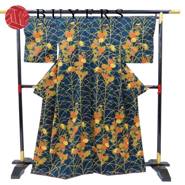 中古 小紋 正絹 藍色 ネイビー イエロー オレンジ 和装 呉服 和服 きもの レディース 女性