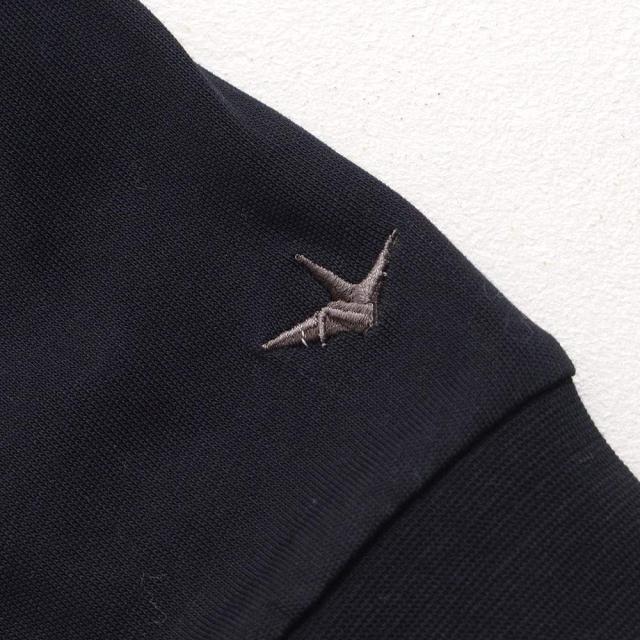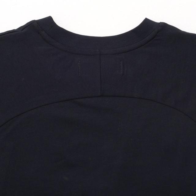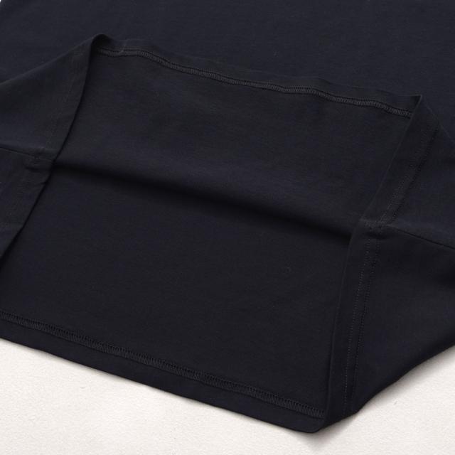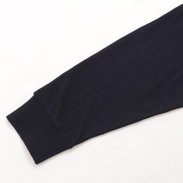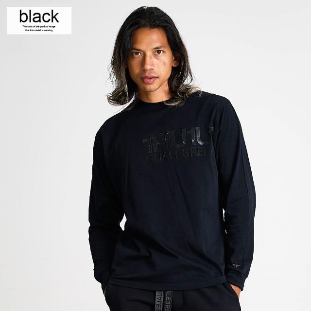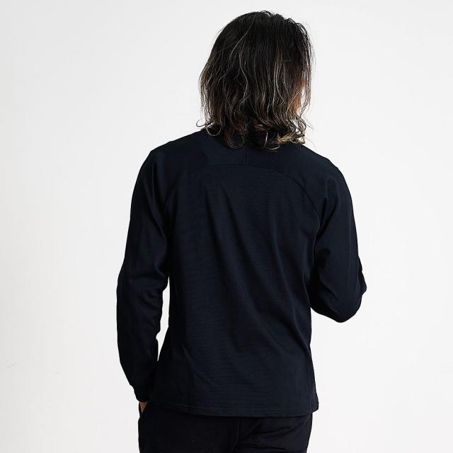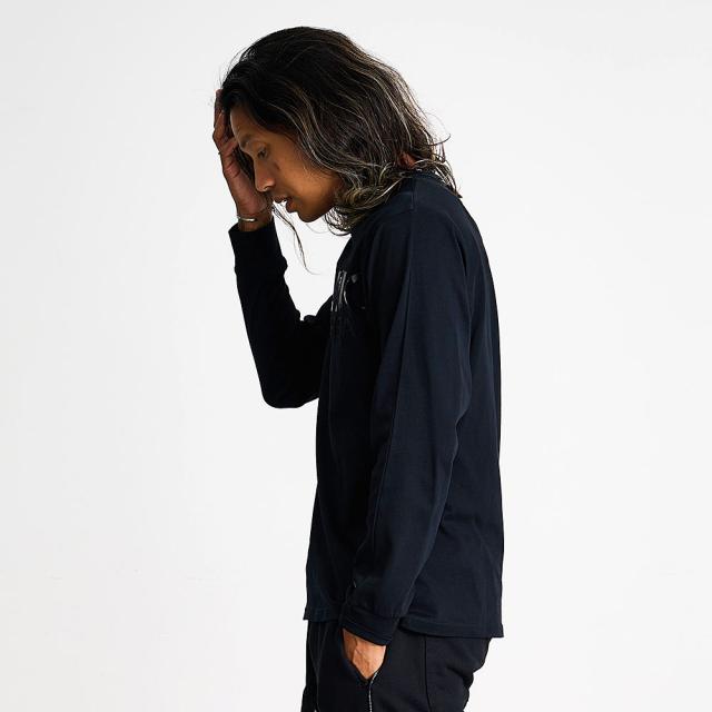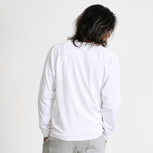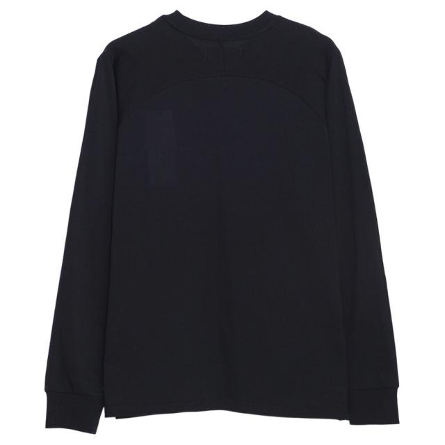 異なる加工のロゴを2段に配置した長袖カットソー。