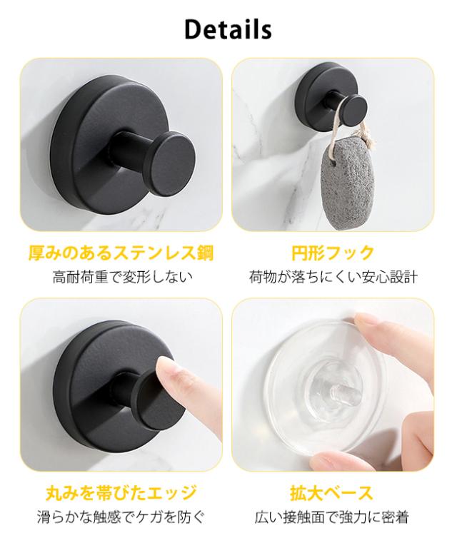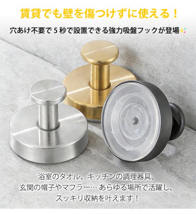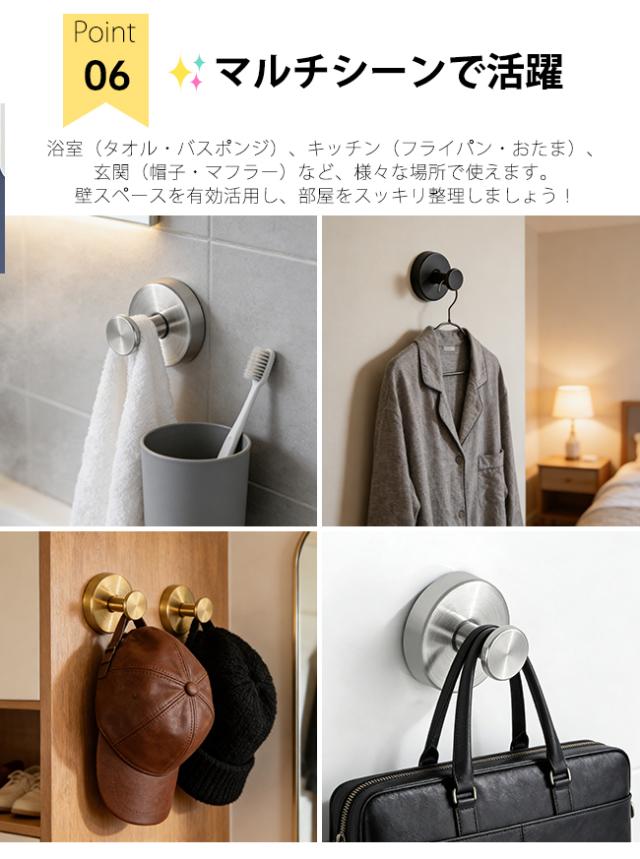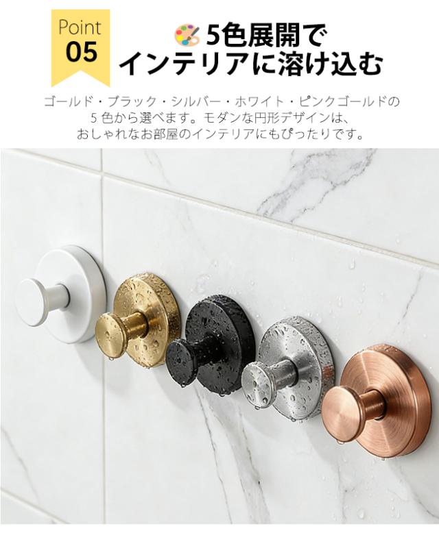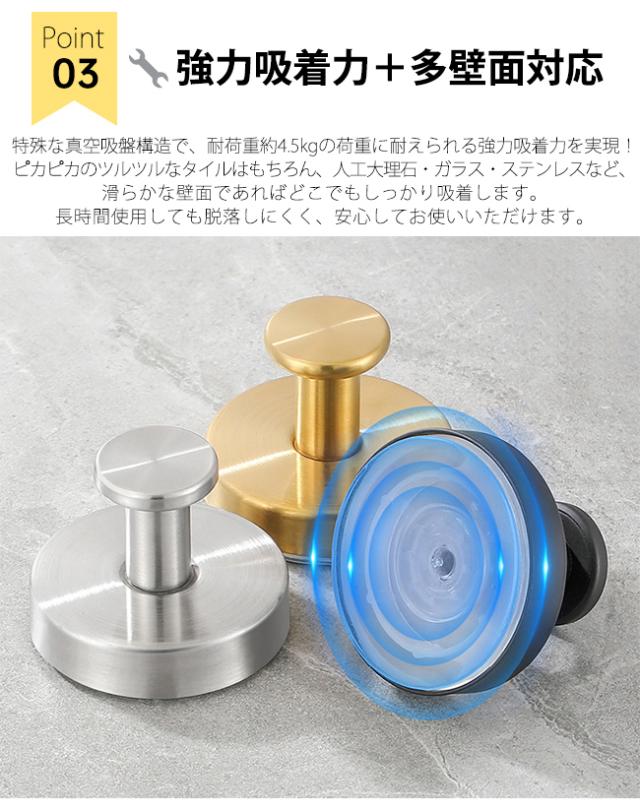 ・当フックの強力吸着力は、バスルームの蒸気や温度変化に影響されず、タオルだけでなく、重いバスタオルや洗面用具を掛けても、びくともしない安定感です。