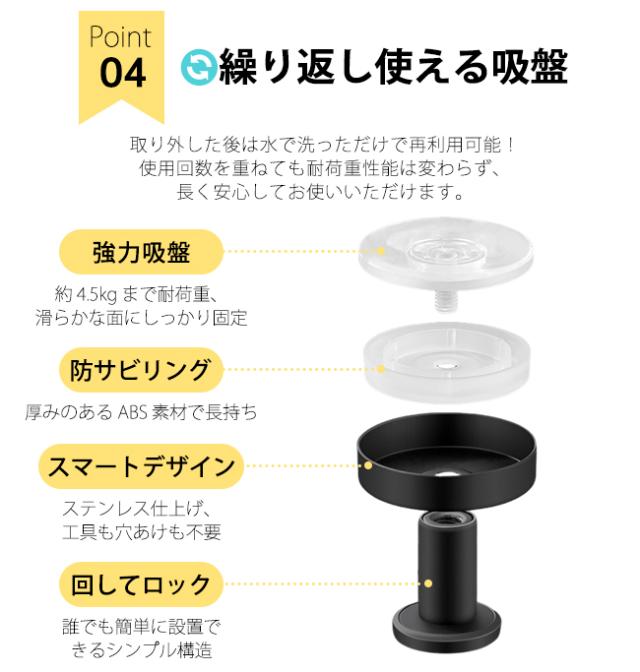 ・強力な吸盤で一般的な吸盤より真空状態を保つことができます。耐荷重は約4.5kg