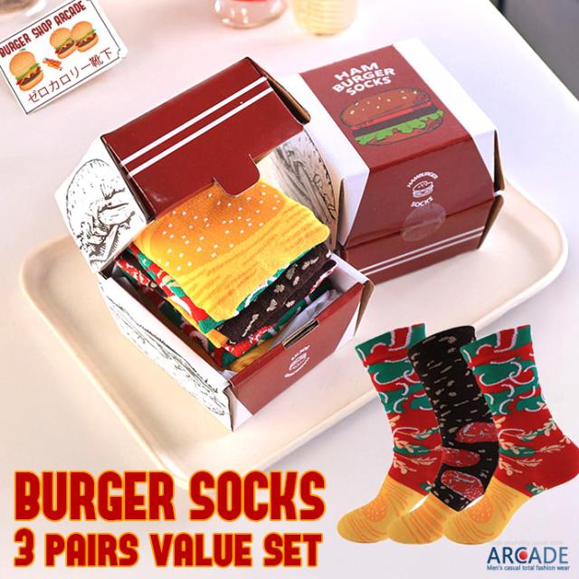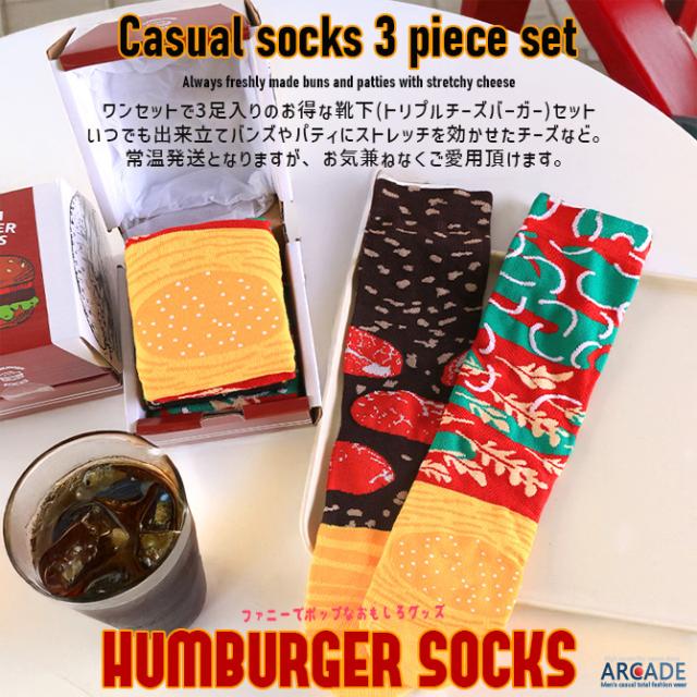 ハンバーガーソックス トリプルチーズバーガー お得な3足セット メンズ 可愛い靴下 バリューセット デリバリーボックス おもしろグッズ 送料無料 バンズ パティ チーズ フレッシュトマト オニオン