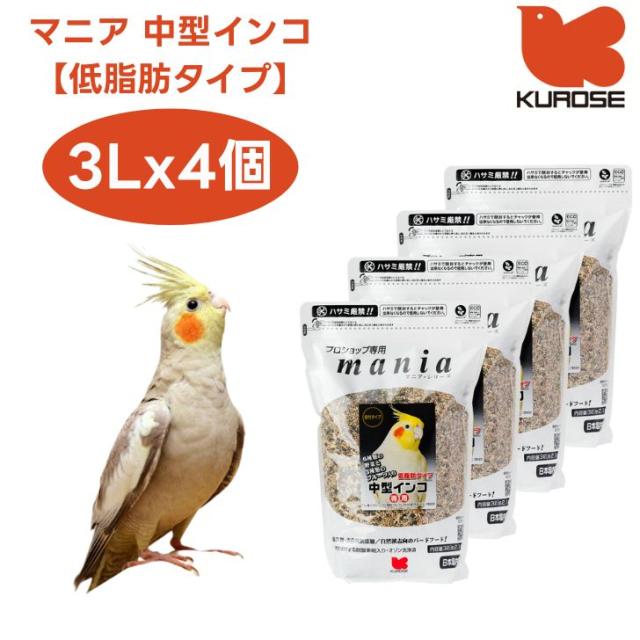 黒瀬ペットフード mania マニア 中型インコ 低脂肪タイプ 3Lx4個 小鳥 エサ 餌 フード インコ 皮付き プロショップ専用